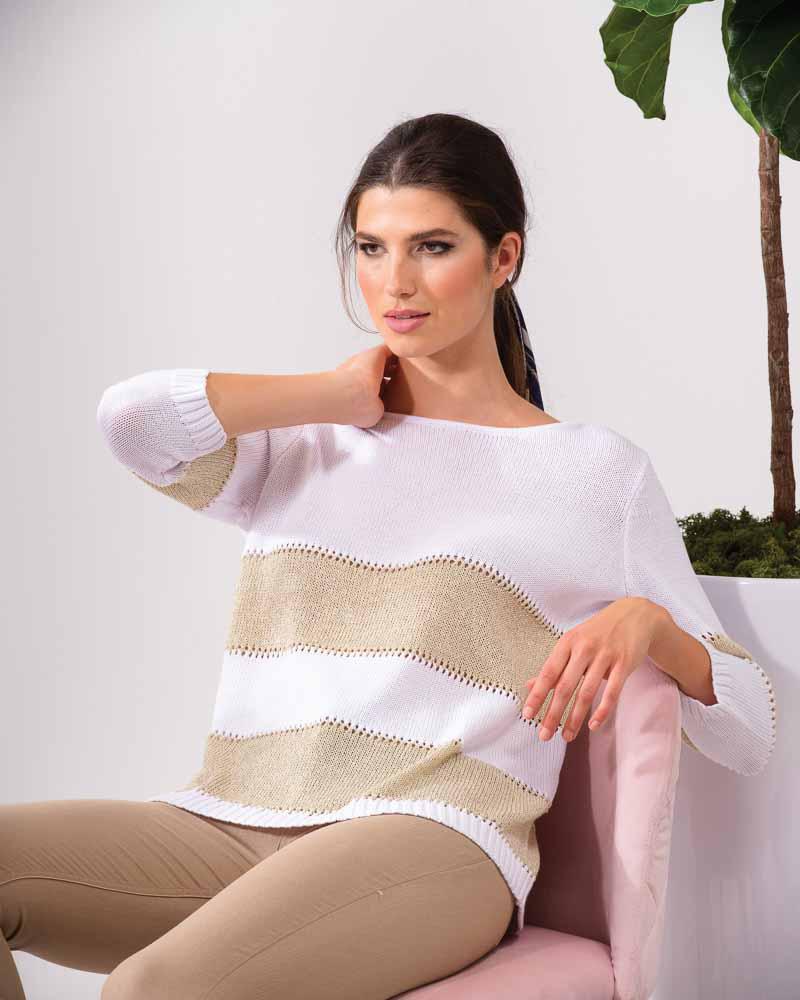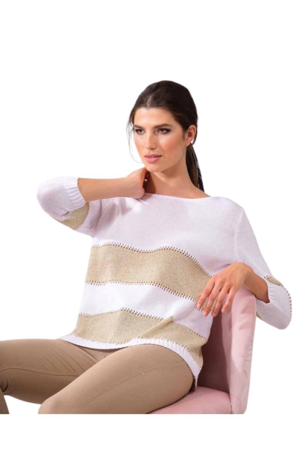 Alison Sheri Camel V-Neck Sweater with Contrast Stripe & Gold Button Detail