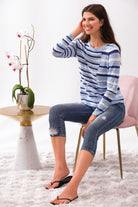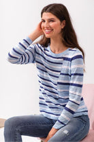 Powder, Navy and White Fine Gauge Striped Sweater with a Touch of Silver