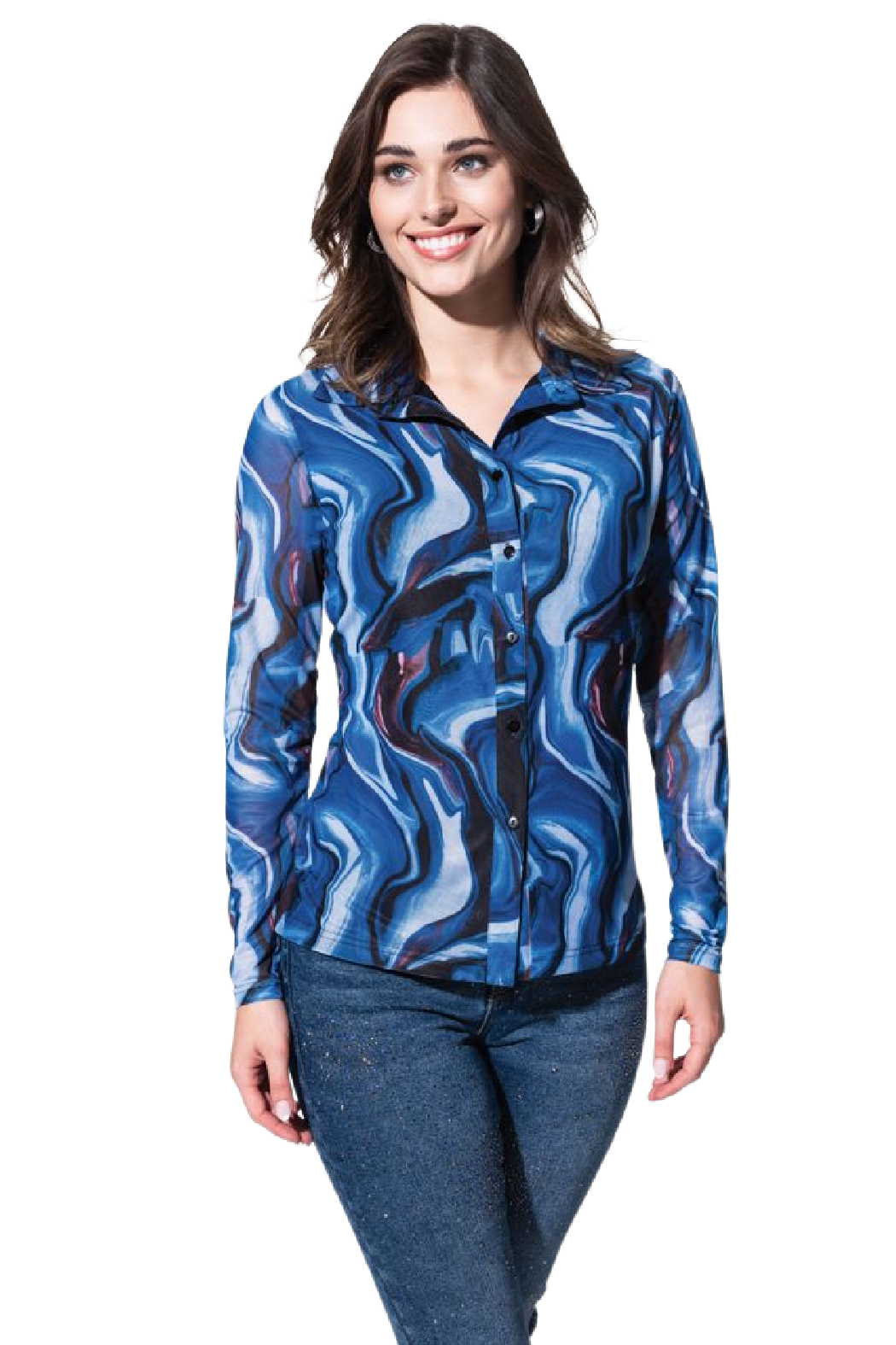 Elavate Your Wardrobe With Our Versatile Waves of Blue Long Sleeve, Button Fron Blouse, Perfect For Creating chic and Comfortable Looks! Shown With Blue Jeans but it Would Look Great with White or Black Pants for a Dressier Look as Well as White or Black Jeans For a Casual Look! Crafted in a Light WEight Lined Mesh Fabric that is Easy to Wear and Travel With and it Gives a Flattering Fit.