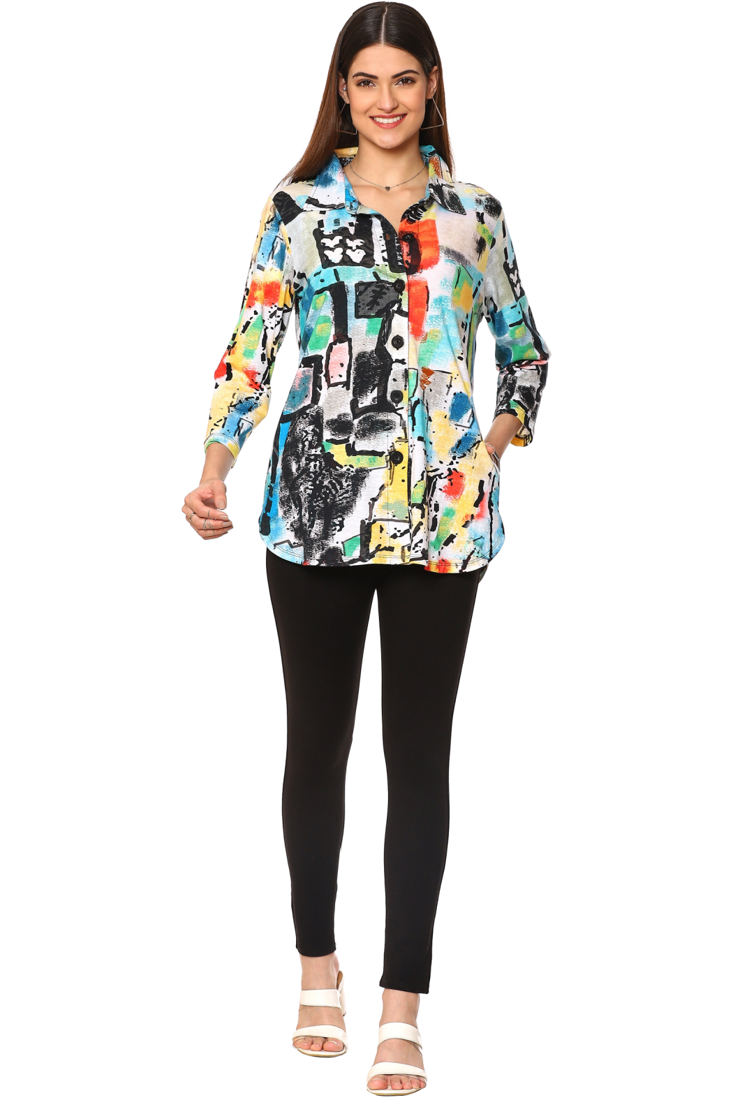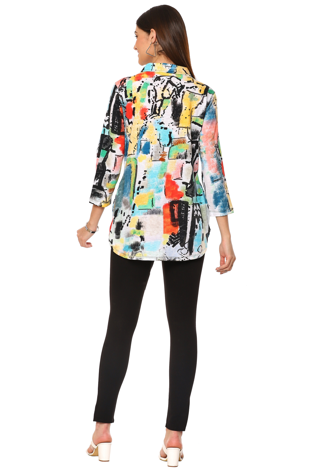 Allergra Grafitti Print Knt Blouse with 3/4 Sleeves and Side Pockets