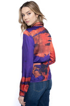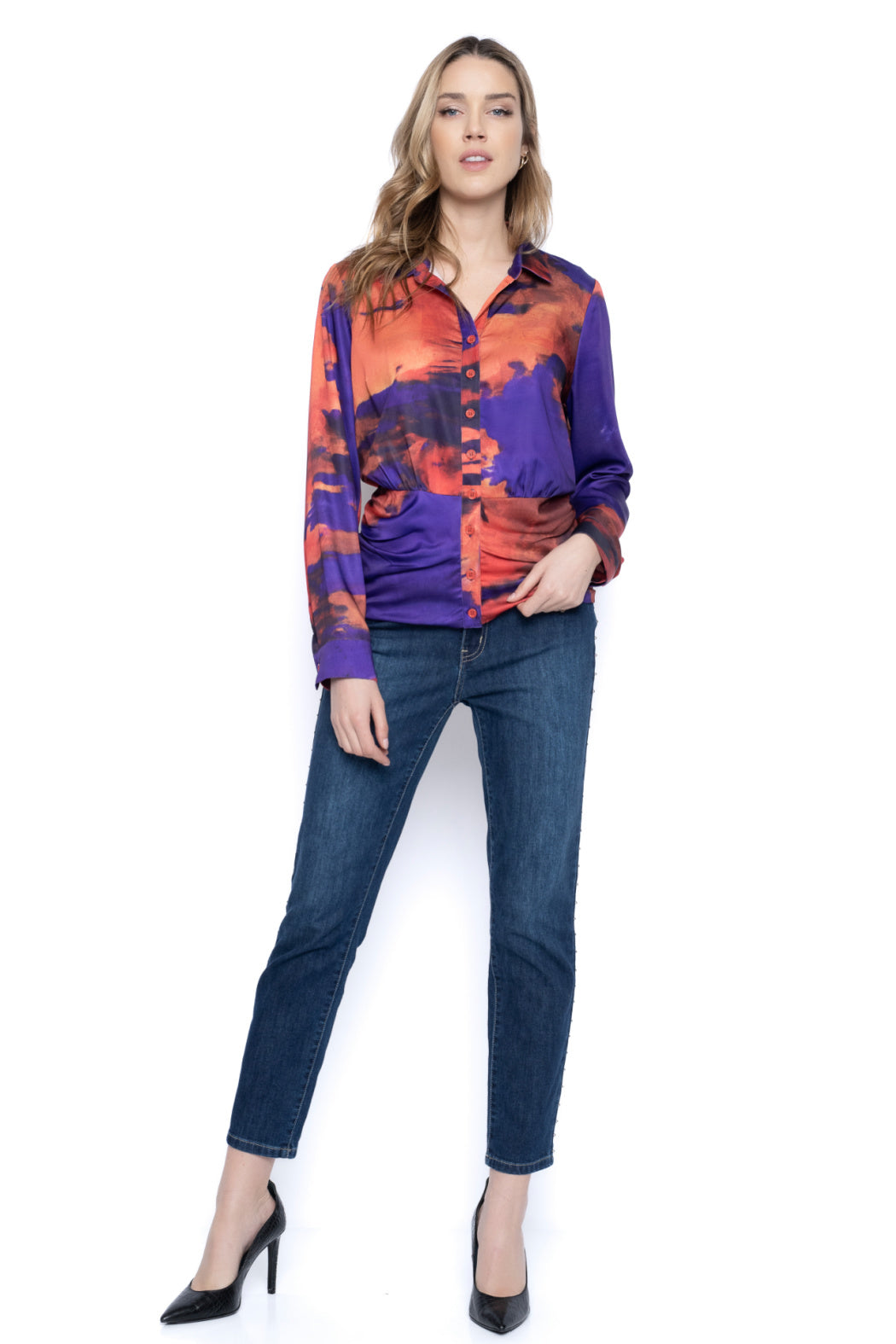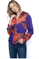 Introducing Our Luxurious and Stylish Silky Paprika and Purple Blouse with Side Rouching, a Must Have Addition to Any Fashion Forward Wardrobe. This Vibrant and Eyecatching Blouse Effortlessly Combines a Rich Royal Purple hue with Pops of Papkika, Creating a Stunning and Captivating Garment. This Blouse Offers a Luxurious Feel and Lustrous Sheen, Ensuring You Stand Out From The Crowd. The Silky Texture Adds an Element of Elegance and Sophistication, Making it The Perfect Blouse For Elevating Your Everyday Style! The Side Rouching Vreates A Flattering Silhouette, Accenturating Your Curves in All The Right Places. Expirience the Luxury and Elegance of This Standout Piece!
