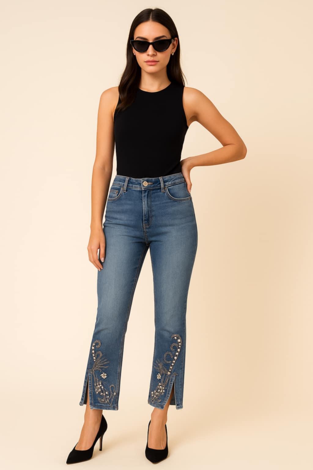 Embellished Split Hem Denim Jeans with Pearls and Rhinestones