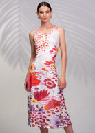 Alison Sheri Sleeveless Floral Midi Dress with Keyhole Neck – Lightweight Summer Resort Wear. Step into effortless elegance with this Alison Sheri Sleeveless Floral Midi Dress, perfect for summer outings, resort vacations, and special occasions. Crafted from a lightweight, breathable fabric, this vibrant floral dress showcases a stunning mix of red, purple, yellow, and orange blooms, creating a lively, eye-catching look. The unique keyhole neckline with geometric detailing adds a sophisticated touch, while the sleeveless design keeps you cool and comfortable on warm days. The A-line midi silhouette flatters every figure, offering both style and ease of movement. Fully Lined