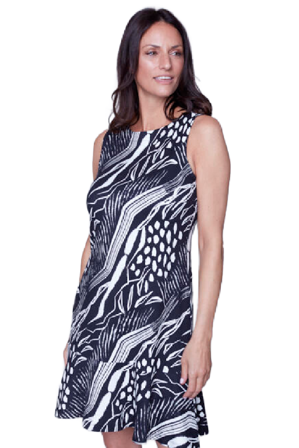 Elevate your wardrobe with this chic and playful sleeveless A-line dress, featuring an eye-catching black and white abstract print that is versatile enough for both day and evening wear. The dress is designed with a comfortable, relaxed fit that gently flares from the bust to the hem, creating a flattering silhouette for a variety of body types.