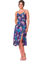 - Eye-catching tropical print: Dressed in a stunning floral motif, the dress features a rich combination of blues and purples that exude a sense of exotic charm.