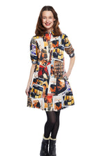 Turn heads in the bold and artistic Dizzy Lizzy Chatham Dress in a Rock 'n' Roll Print—a true statement piece for fashion rebels and vintage lovers alike. This striking A-line shirt dress features a dynamic all-over rock 'n' roll collage print, showcasing retro movie posters and music icons that channel pure 70s and 80s glam. Designed with a relaxed fit, collared neckline, and cuffed half-sleeves, this dress combines effortless cool with high-impact style. Crafted from a crisp cotton blend fabric, the Chatham Dress offers all-day comfort with a playful, edgy twist. The frayed hem adds a rebellious touch, while the vivid graphic pattern makes it a standout for music festivals, urban strolls, or creative daywear. Pair it with black tights and shearling-lined boots for a cozy rocker-chic ensemble.