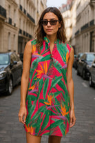 Moda Posa will Unleash your sophisticated side with the Gabriella tropical fuchsia pink, orange and green poly shift dress. Boasting a tab collar, pockets, and subtle side openings, this dress is