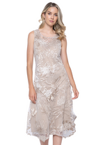 Elevate your elegance with this exquisite sleeveless midi dress, featuring intricate floral design on delicate sheer fabric. The soft, neutral-toned fabric adds a touch of sophistication, while the airy, layered silhouette provides graceful movement and a flattering fit. Designed with a round neckline and an asymmetrical hemline, this dress blends timeless femininity with contemporary charm. Ideal for weddings, evening soirées, or special occasions, it offers both comfort and refinement. Pair it with heels and minimal accessories for a look that’s effortlessly stylish and endlessly chic.