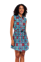 Elevate your style with the Carlotta dress. Designed for the modern woman, this sleeveless shirt dress boasts a sophisticated turquoise, navy and red majolica motif, complete with intricate bead and embroidery details. Convenient pockets add practicality to its chic design. Be the envy of the crowd with this exclusive piece inspired by the vibrant colors of the Mediterranean Sea