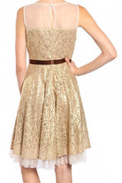Tan Lace Dress with Illusion Neckline and Mocha Beaded Accent Waistline and Tulle Under Layer