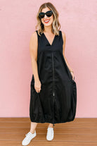 Michael Tyler Black Zip-Front Sleeveless Dress - Modern Chic with a Playful Edge Elevate your wardrobe with this Michael Tyler Black Sleeveless Dress, a perfect blend of effortless chic and versatile styling. Designed for the modern woman, this A-line silhouette dress features a flattering V-neckline, a sleek front zip closure, and an adjustable drawstring hem for customizable shape and comfort. The side ruched detailing adds subtle texture and a touch of urban sophistication, making it ideal for both casual outings and stylish events. Crafted from lightweight, breathable fabric, this easy-care black dress offers all-day comfort while maintaining a polished look. Pair it with sneakers for a fun daytime vibe or elevate it with heels and statement jewelry for an evening out. This Michael Tyler dress transitions seamlessly from season to season, making it a must-have staple for your wardrobe.