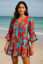 Key Features: Brand: Moda Posa Style Name: Brigida 100% lightweight, breathable cotton Vibrant turquoise with bold coral-red print Tunic-style silhouette for relaxed resort style Lace-up V-neckline with tassel detail Ruffle-trimmed three-quarter sleeves Tiered hem for added movement and style Ideal for vacations, beach days, and summer outings Comfortable and easy fit