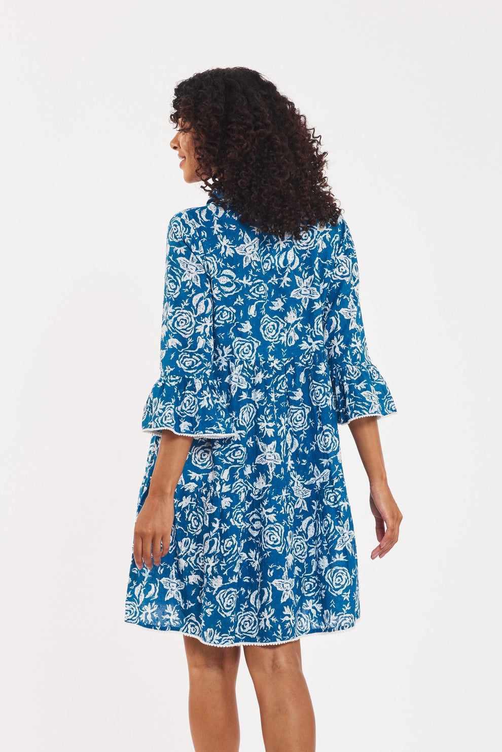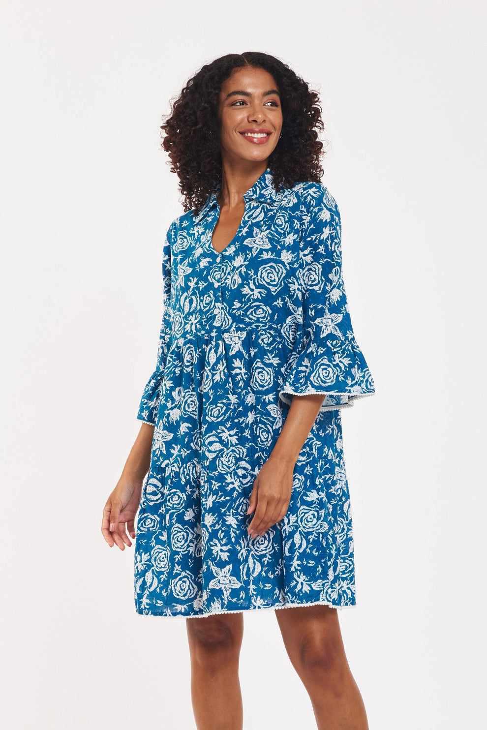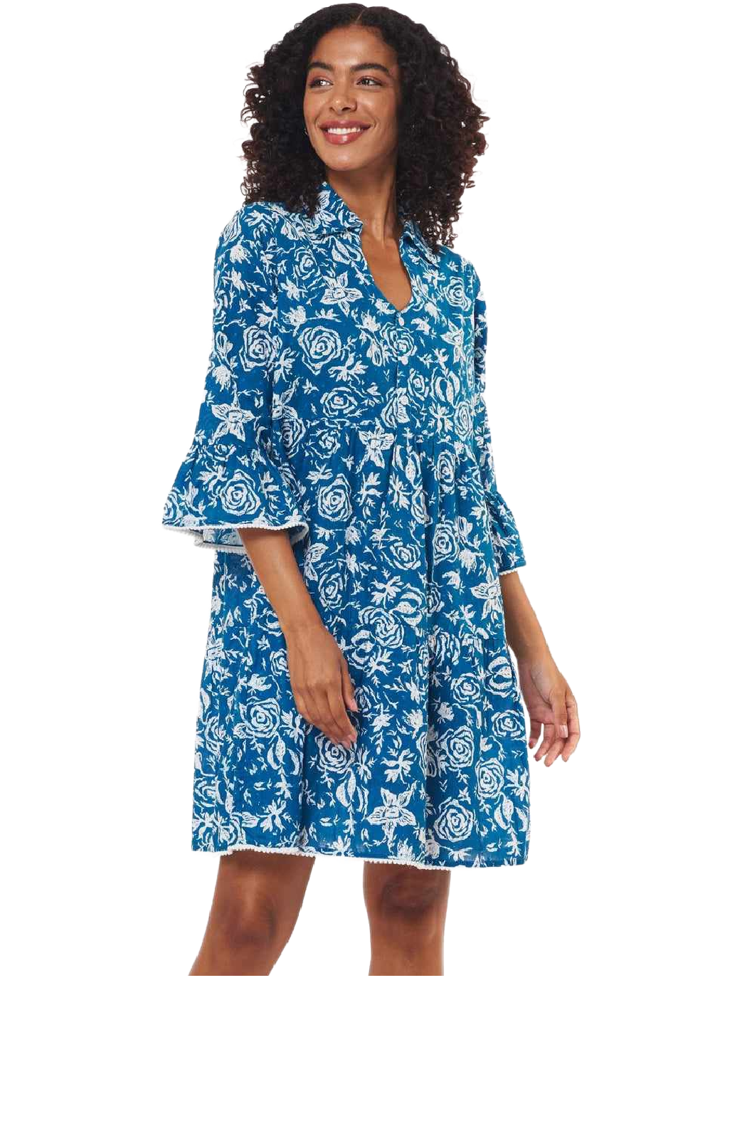 Indulge in sophistication and comfort with the Cadenza dress. Crafted from luxurious and soft cotton swiss dot with a classy navy and white floral print, this practical dress is elevated with delicate pom pom trim and a classic collar. Perfect for any occasion, it's a must-have addition to your wardrobe.
