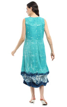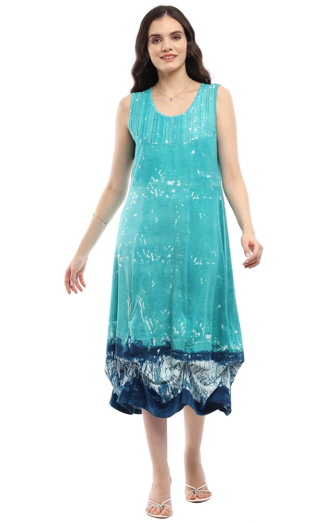Keywords: Parsley & Sage dress, teal tie-dye dress, sleeveless summer dress, handkerchief hem dress, resort wear, boho chic dress, embroidered dress, casual midi dress