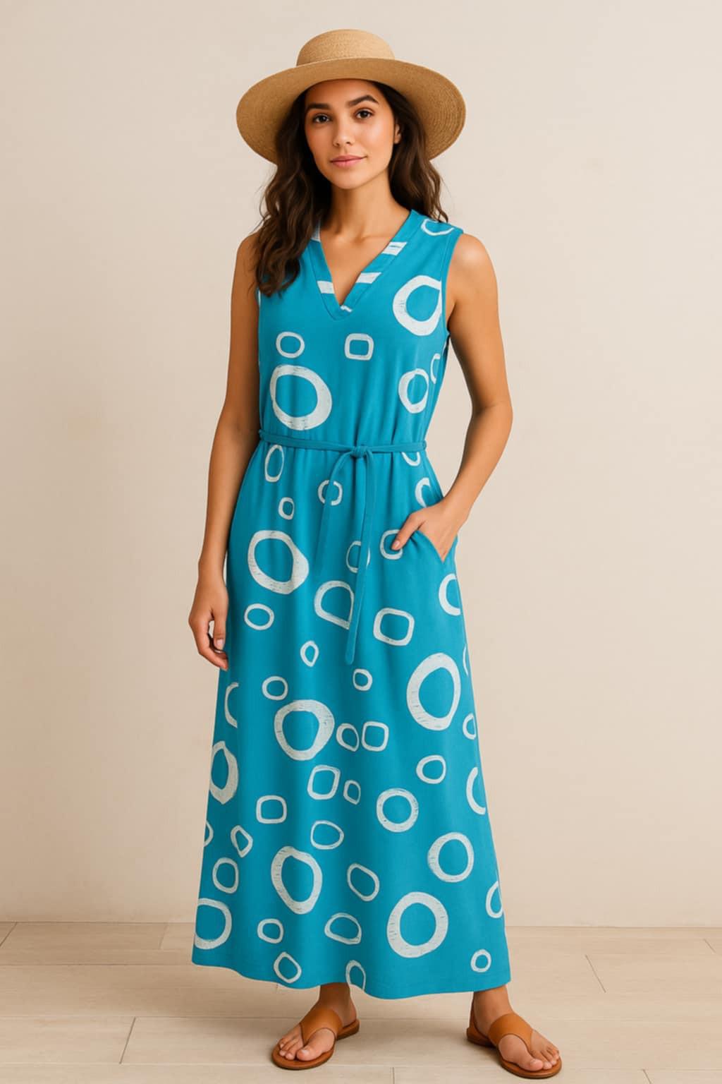Parsley & Sage Turquoise Knit Sundress with Circle Print – Sleeveless, Lightweight & Travel-Friendly Step into effortless summer style with this vibrant Parsley & Sage turquoise sundress, designed for both comfort and flair. Made from a soft stretch knit fabric, this sleeveless midi dress features an eye-catching white abstract circle print on a bold turquoise background that flatters all skin tones. The flattering notched neckline with pleated detail adds an elegant touch, while the adjustable tie waist allows for a customizable fit. Designed with side seam pockets (or optional clean silhouette version), this lightweight dress combines practicality with a sleek A-line silhouette, making it ideal for travel, weekend getaways, and casual brunches.