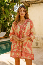 Key Features: 100% lightweight breathable cotton Vibrant pink and yellow baroque-inspired print Flowy, relaxed fit for comfort and ease Pom-pom trim at hem and sleeve edges Flattering V-neckline with pleated front detailing 3/4 length sleeves Above-knee length Ideal for resort wear, summer vacations, and casual days