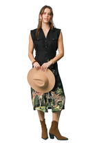 This chic and versatile sleeveless dress is a perfect blend of style and functionality. Featuring a tailored black bodice with button-down detailing, flap pockets, and a belted waist for a flattering silhouette, it pairs utilitarian elements with feminine charm. The standout design feature is the vibrant, nature-inspired skirt adorned with bold prints of leopards, giraffes, and lush foliage, exuding an adventurous yet elegant vibe. Crafted from high-quality materials, this dress ensures comfort while maintaining a polished look. Ideal for both casual outings and statement daywear, it can be effortlessly styled with boots and accessories for a complete, sophisticated ensemble. This unique piece is sure to be a conversation starter, combining practicality with a bold, eye-catching design.