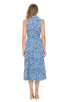 Elevate your wardrobe with this stunning sleeveless midi dress, featuring a vibrant blue and white floral-inspired print. Designed for effortless elegance, this dress boasts a classic collared neckline, button-down front, and a flattering self-tie waist belt for a customized fit. The tiered, A-line skirt adds a graceful movement, making it perfect for both casual outings and more refined occasions. Crafted from lightweight, breathable fabric, this dress ensures all-day comfort while keeping you stylish. Pair it with sandals for a relaxed daytime look or dress it up with heels for an evening out. A must-have addition to any fashion-forward wardrobe!