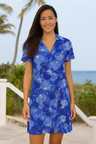 Key Features: Made in the USA Vibrant sand dollar print in ocean-inspired blues Lightweight and breathable knit fabric Flattering A-line shape, above-the-knee length Short sleeves with open collared neckline Perfect for resort, vacation, or everyday wear