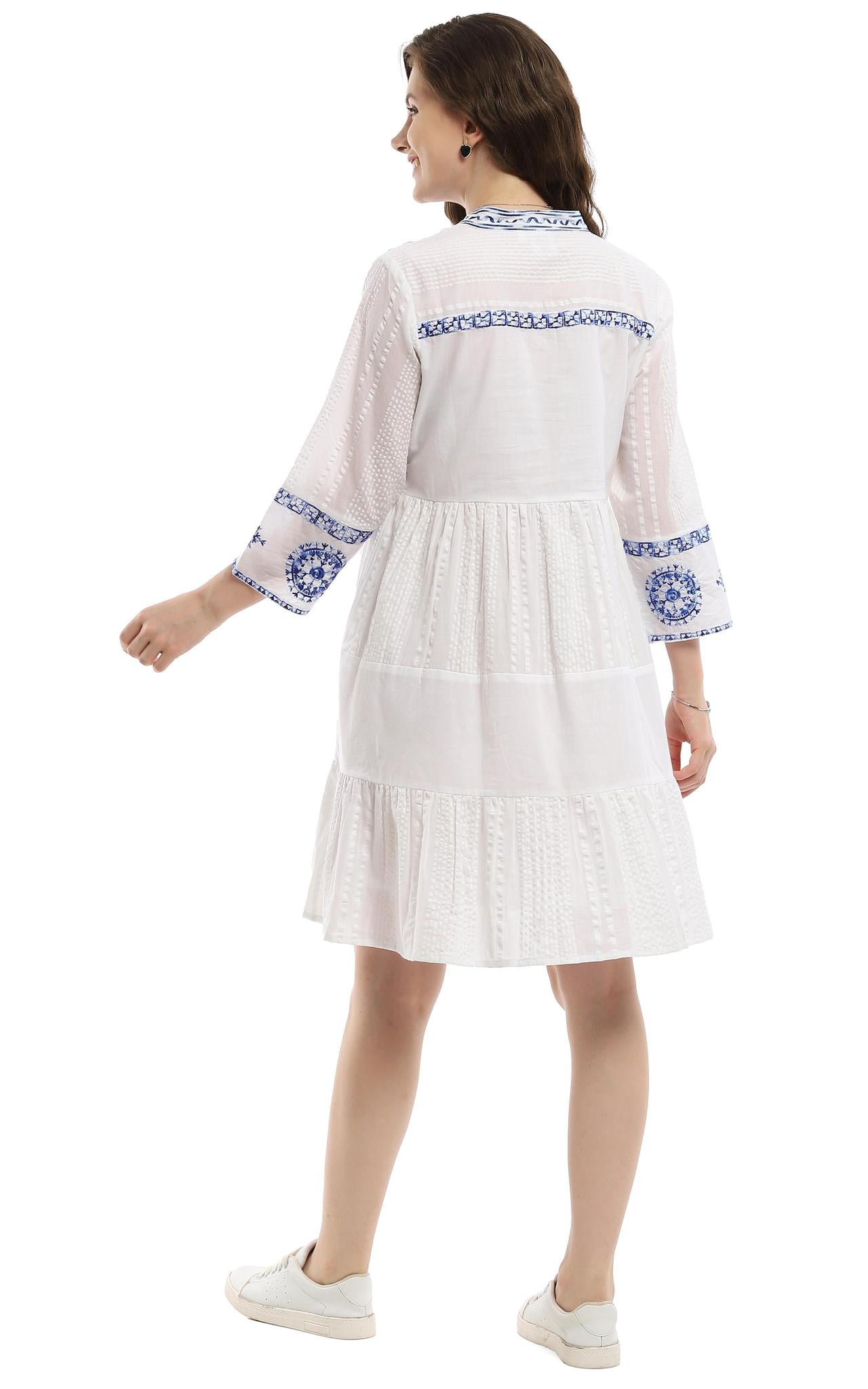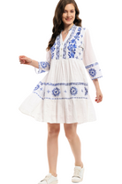 In Parsley & Sage Dresses you will Experience effortless elegance. This chic white bohemian-style dress, adorned with intricate blue floral embroidery will be a wardrobe staple. Crafted from lightweight, textured fabric, this dress offers a comfortable and breathable fit—ideal for warm-weather outings. The relaxed silhouette features a tiered, flowy design that enhances movement while ensuring a flattering drape. A classic V-neckline with delicate button detailing adds sophistication, while the three-quarter sleeves with embroidered cuffs elevate the overall aesthetic. The intricate blue embroidery, inspired by traditional patterns, lends a timeless and artistic charm. Whether paired with sandals for a beach-ready look or sneakers for a casual day out, this dress seamlessly blends comfort and style. Perfect for vacations, casual gatherings, or summer outings, this embroidered boho dress is a must-have piece for every fashion-forward wardrobe.