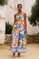 Turn heads in this stunning tropical print sundress, the ultimate resort chic look. Featuring a vibrant multicolor pattern with citrus and abstract motifs, this breezy midi dress is crafted from lightweight fabric that moves beautifully. Designed with slender spaghetti straps, a flattering empire waist, and a bold printed border hem, it's perfect for vacation, summer parties, or a stylish stroll along the coast. Pair it with strappy sandals and a woven bag for effortless island elegance.