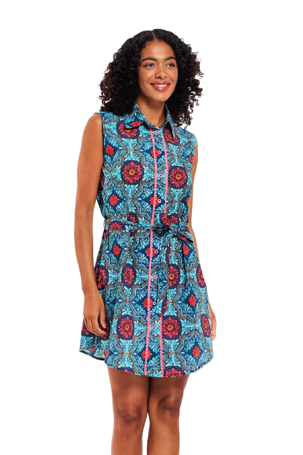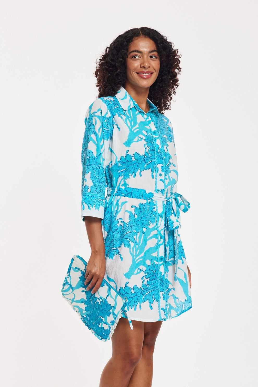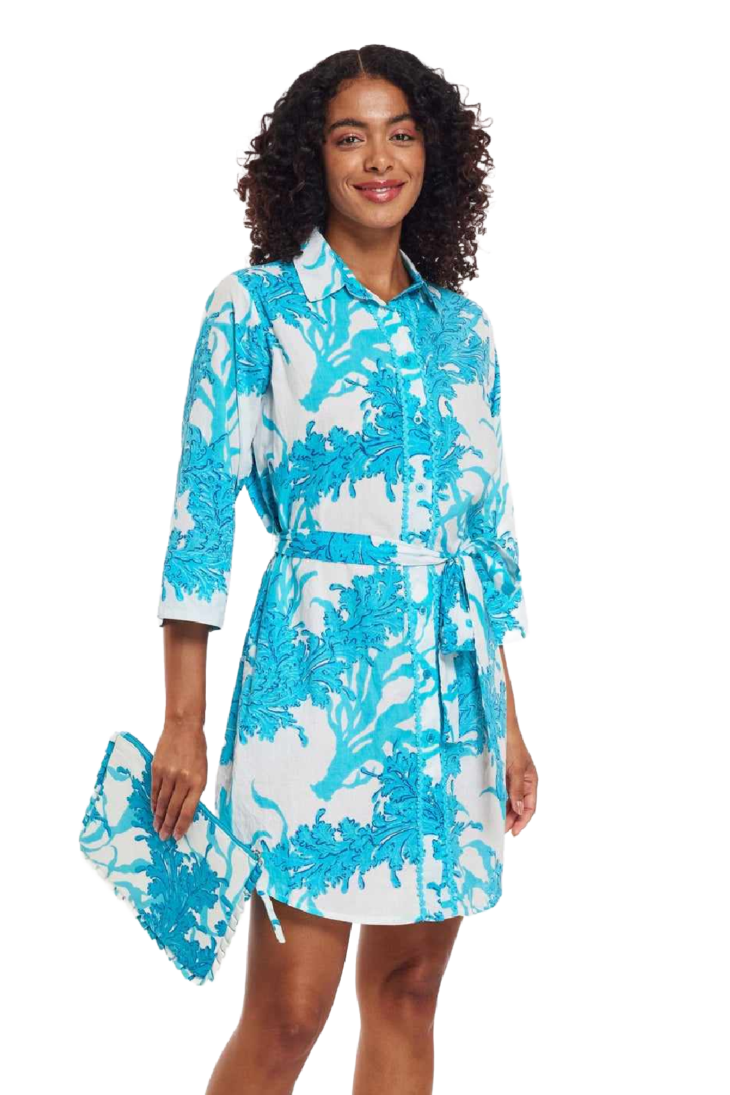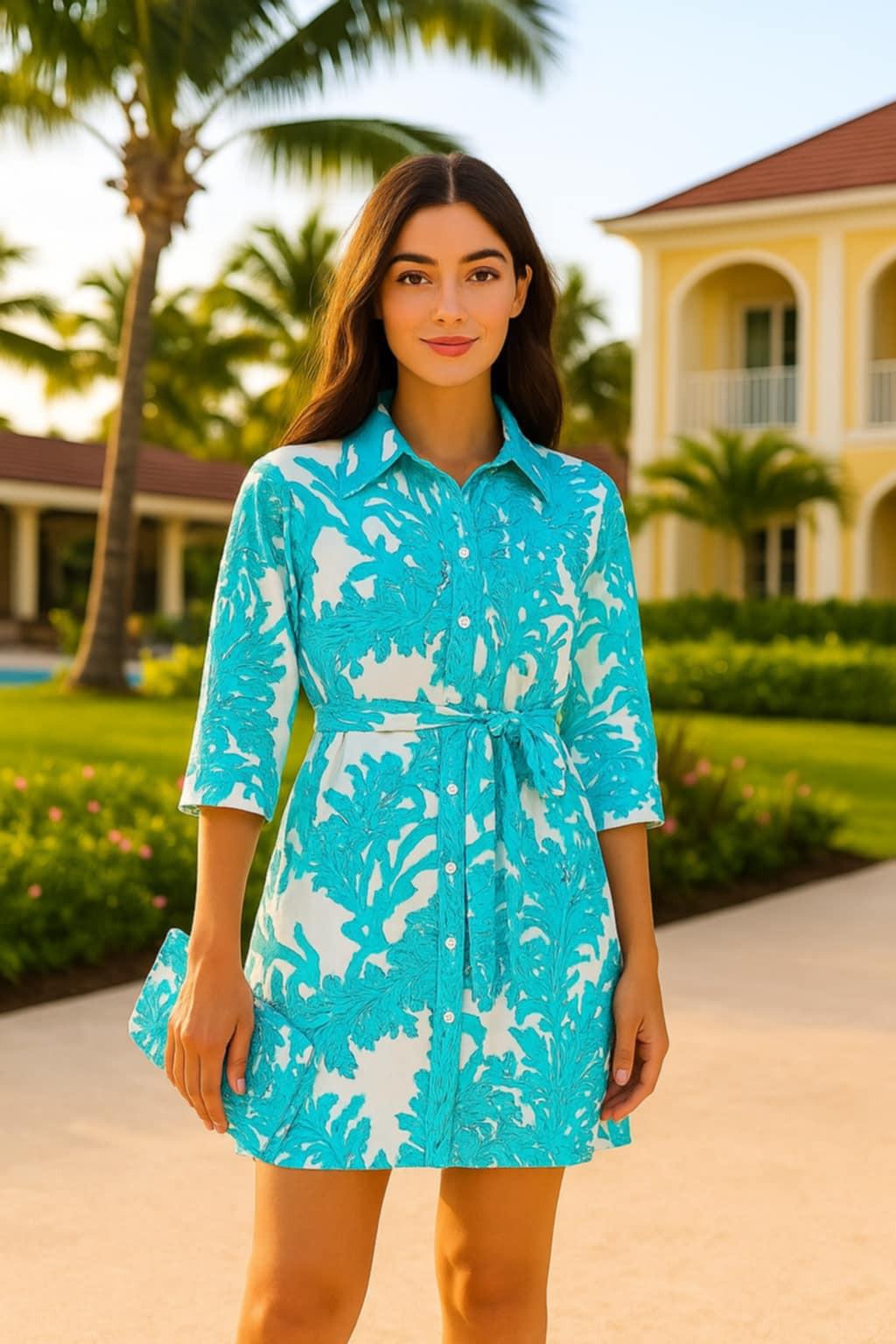 Turquoise Coral Print Cotton Shirt Dress by Moda Posa