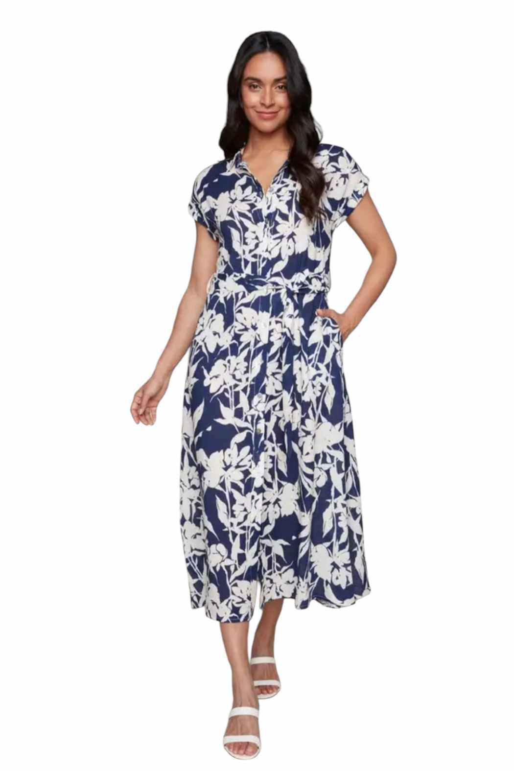 Navy and Sand Floral Linen Shirt Dress