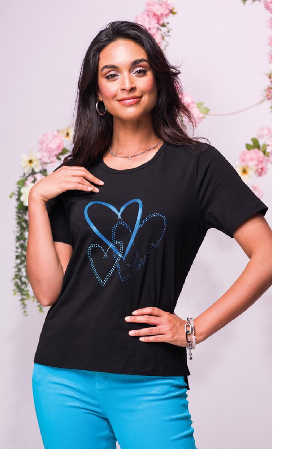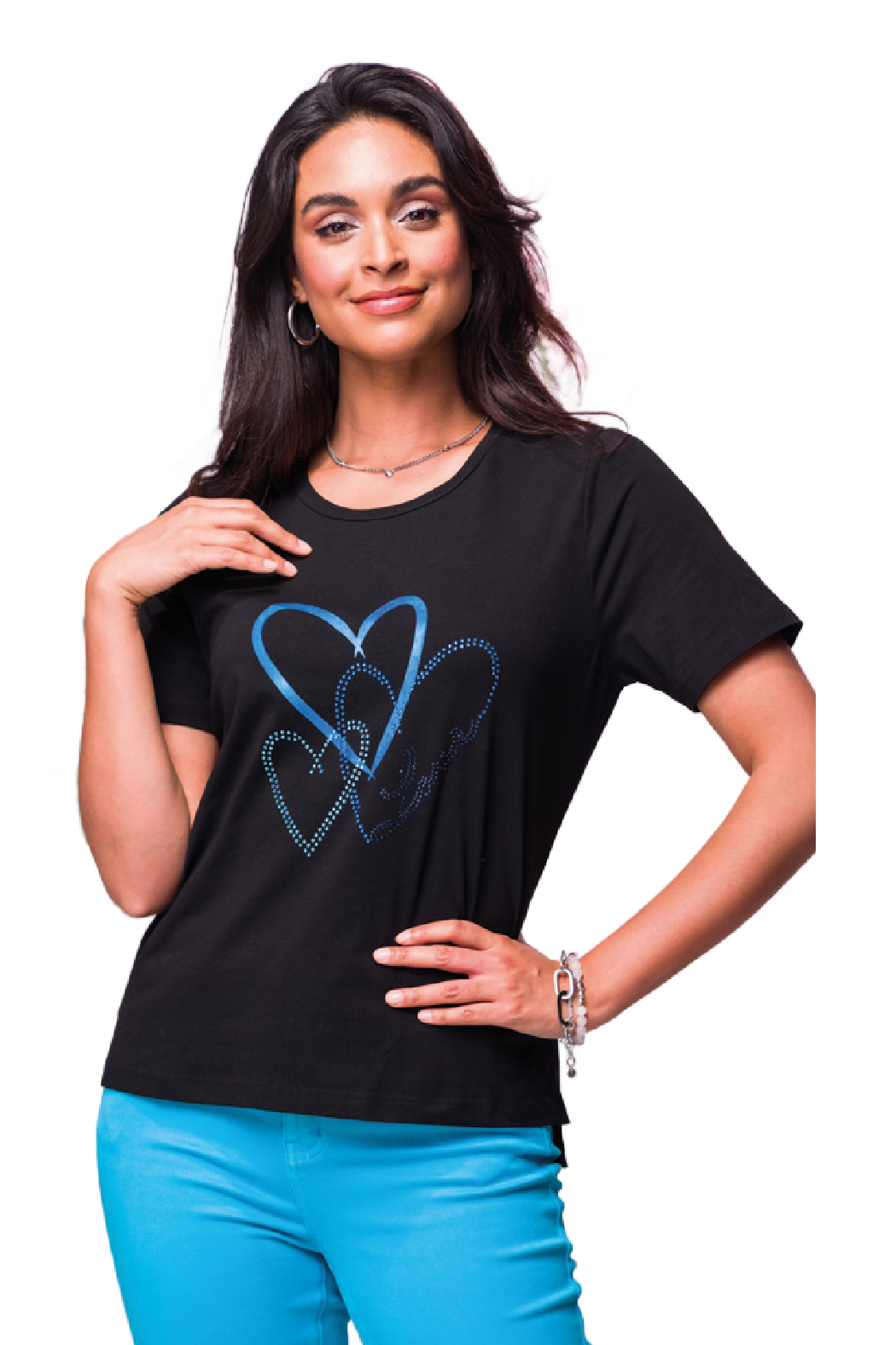 Check out our chic and stylish Graphic Tee! This versatile black t-shirt features a playful and eye-catching blue bling heart design, that adds just the right amount of sparkle to your everyday look. The shirt's design strikes a perfect balance between boldness and subtlety, making it an excellent choice for both day and night wear.