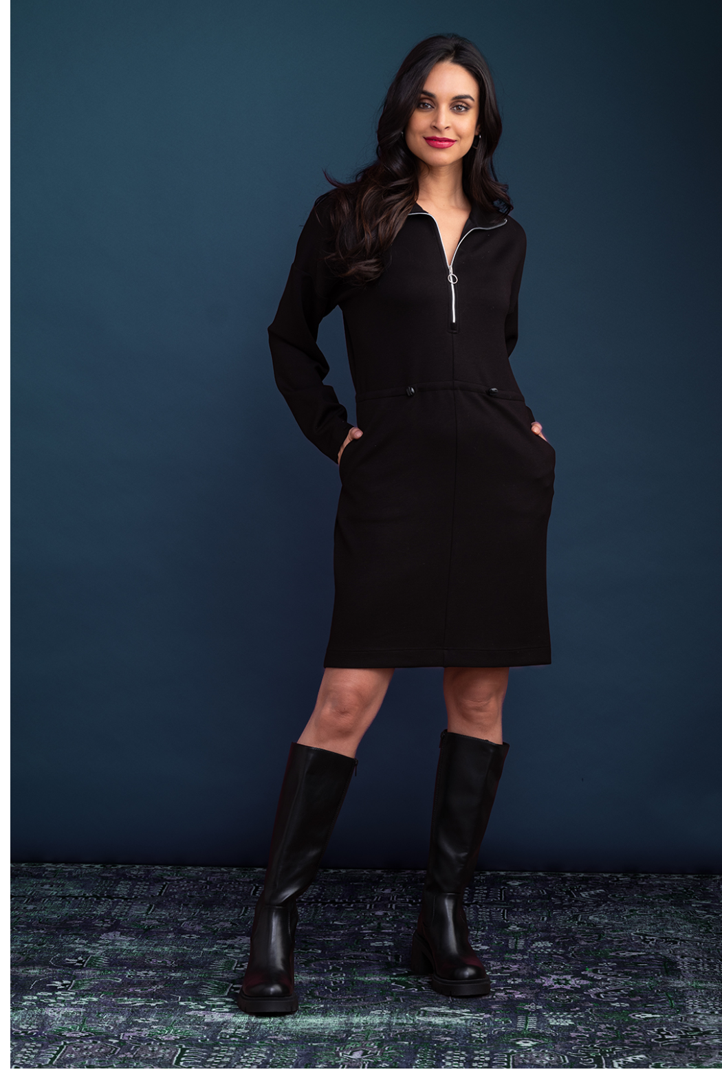 This versatile black dress is the perfect blend of contemporary style and everyday comfort. Designed for the modern woman, it features a stylish zippered neckline that adds both flair and functionality, allowing you to adjust the fit to your personal preference. The dress is crafted from high-quality, soft fabric ensuring all-day comfort and ease of movement. A fitted waist with subtle detailing accentuates your silhouette, providing a flattering shape. Key Features: - *Zippered Neckline:* Eye-catching and functional, offering adjustable comfort and style. - *High-Quality Fabric:* Soft, durable material ensures lasting comfort and ease of movement. - *Fitted Waist:* Enhances your natural silhouette with a stylish, flattering fit. - *Versatile Design:* Suitable for various occasions, from casual outings to more formal events. - *Side Pockets:* Convenient and practical, adding an element of utility to the dress. Whether you're heading to the office or out for a casual evening with friends, this black dress is a must-have addition to your wardrobe, delivering both style and functionality. Pair it with your favorite boots or heels for a complete, polished look.
