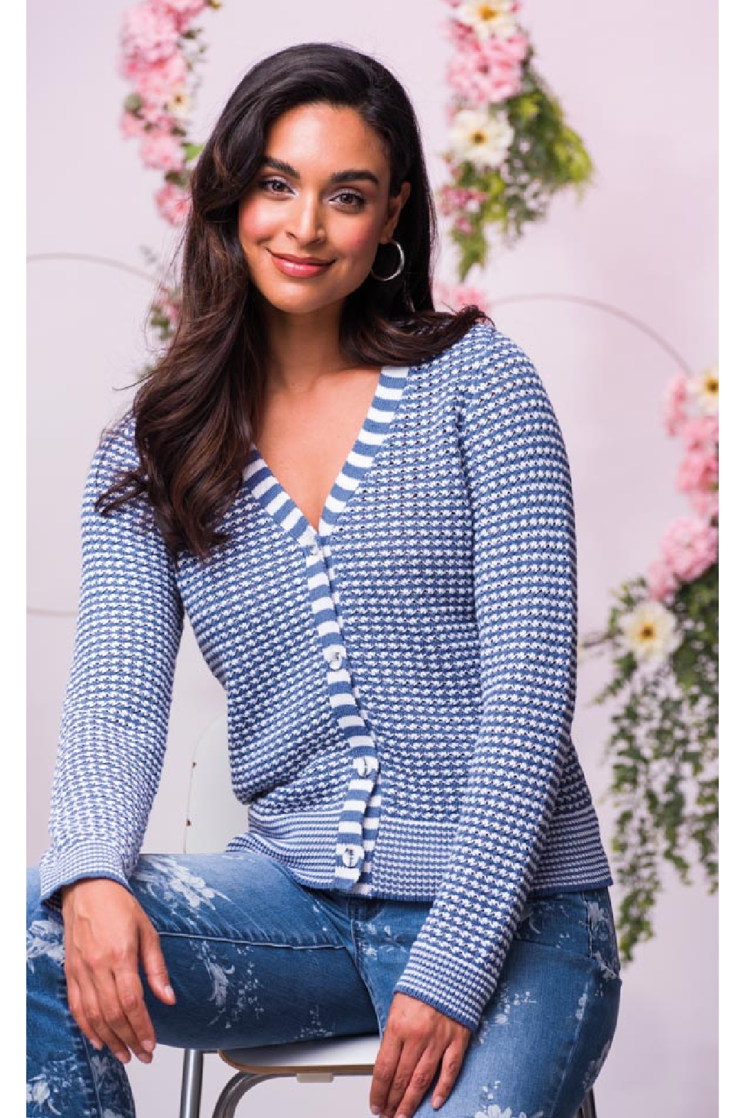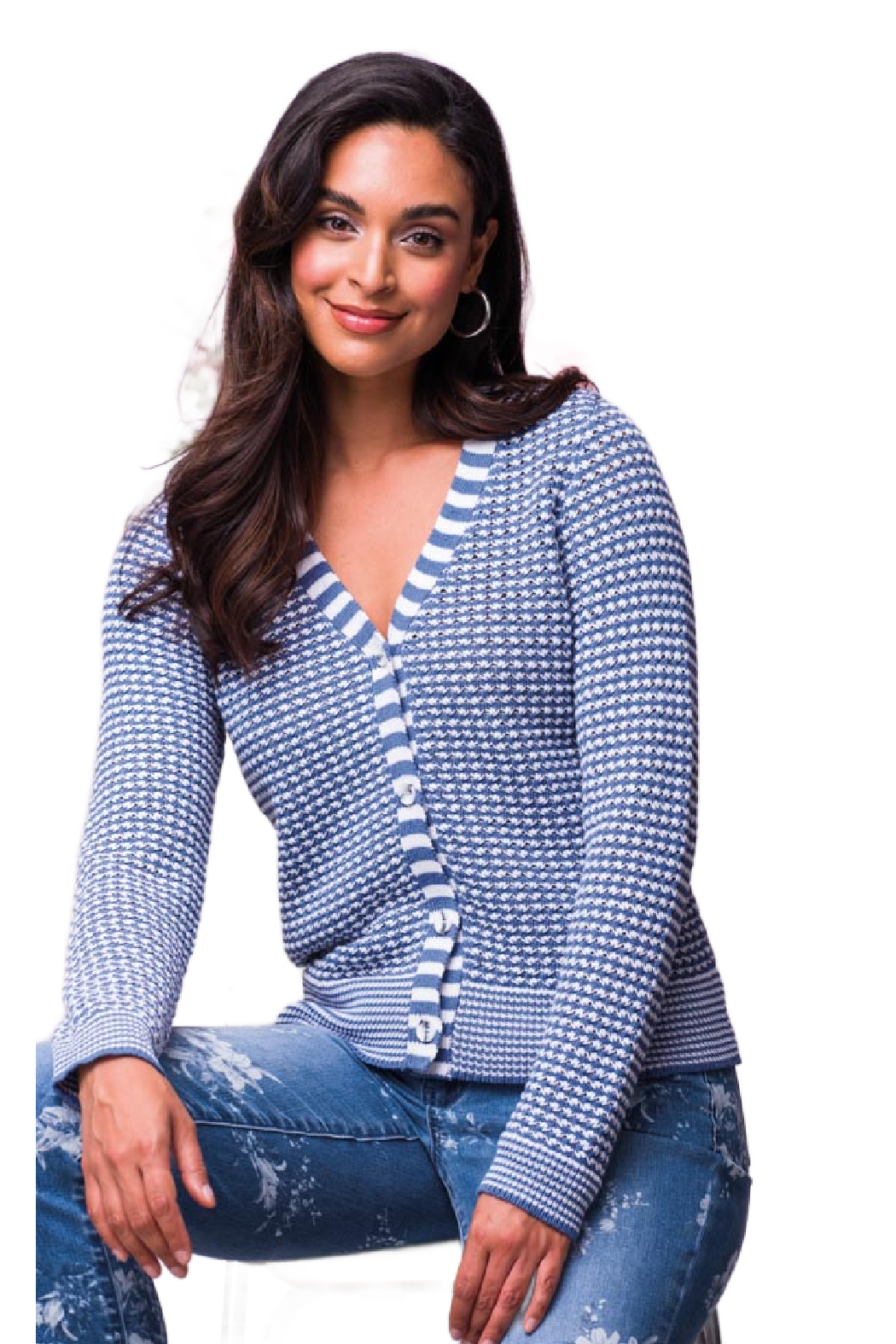 Elevate your wardrobe with this chic and versatile women's knitted cardigan. The cardigan boasts a fashionable two-tone blue and white houndstooth pattern that adds a touch of timeless elegance to any outfit. Crafted with a comfortable knit fabric, it ensures a cozy feel without compromising on style.