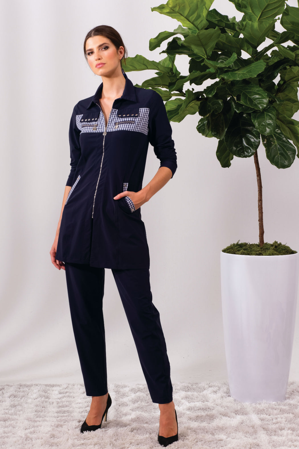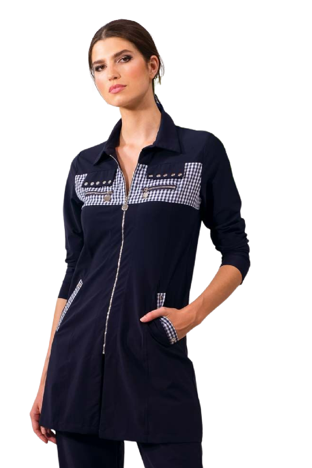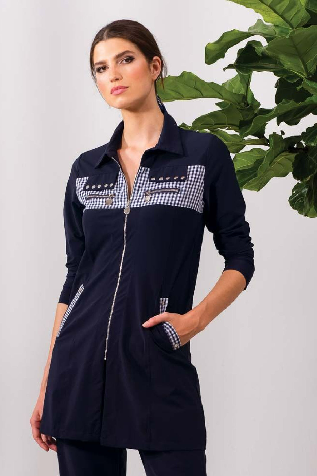 Navy Gingham Accent Active Wear Jacket