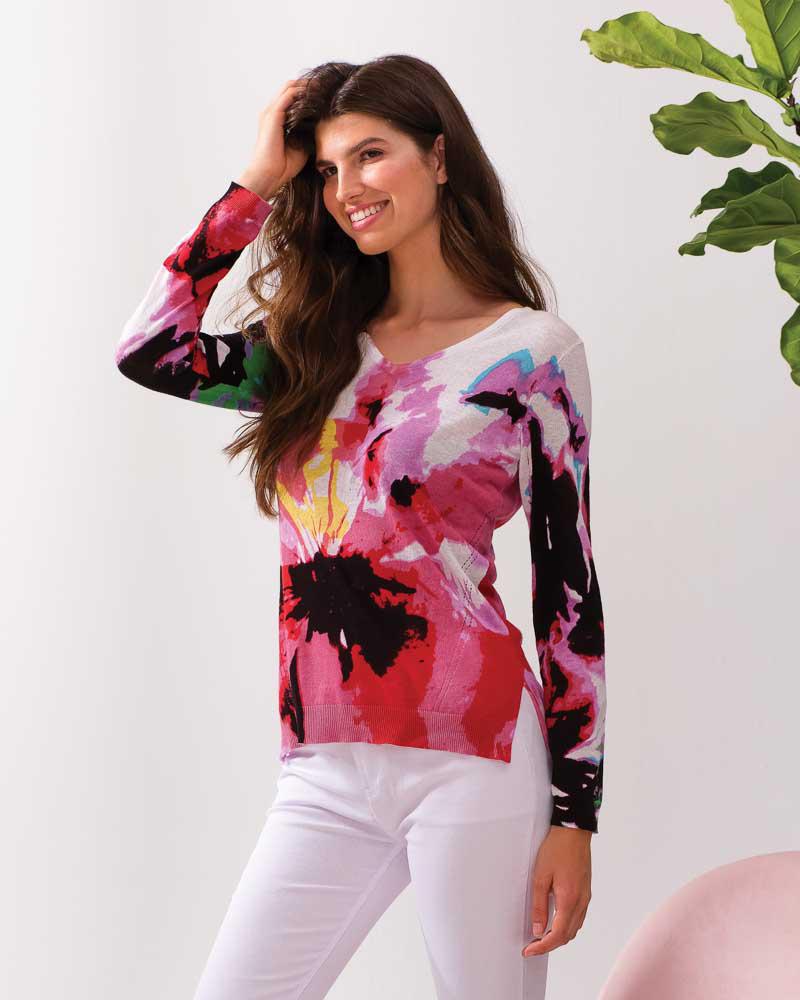 Alison Sheri will add a pop of color to your wardrobe with this vibrant lightweight sweater featuring an eye-catching abstract floral print. Designed for comfort and style, this long sleeve knit top is made from a soft, breathable fabric that’s perfect for layering in transitional seasons like spring and fall. The feminine V-neckline enhances the flattering silhouette, while the bold, watercolor-inspired design in pink, red, black, and hints of green and white brings a modern artistic flair. Whether paired with crisp white jeans for a fresh daytime look or dressed up for evening outings, this versatile lightweight pullover sweater effortlessly combines comfort and high fashion.