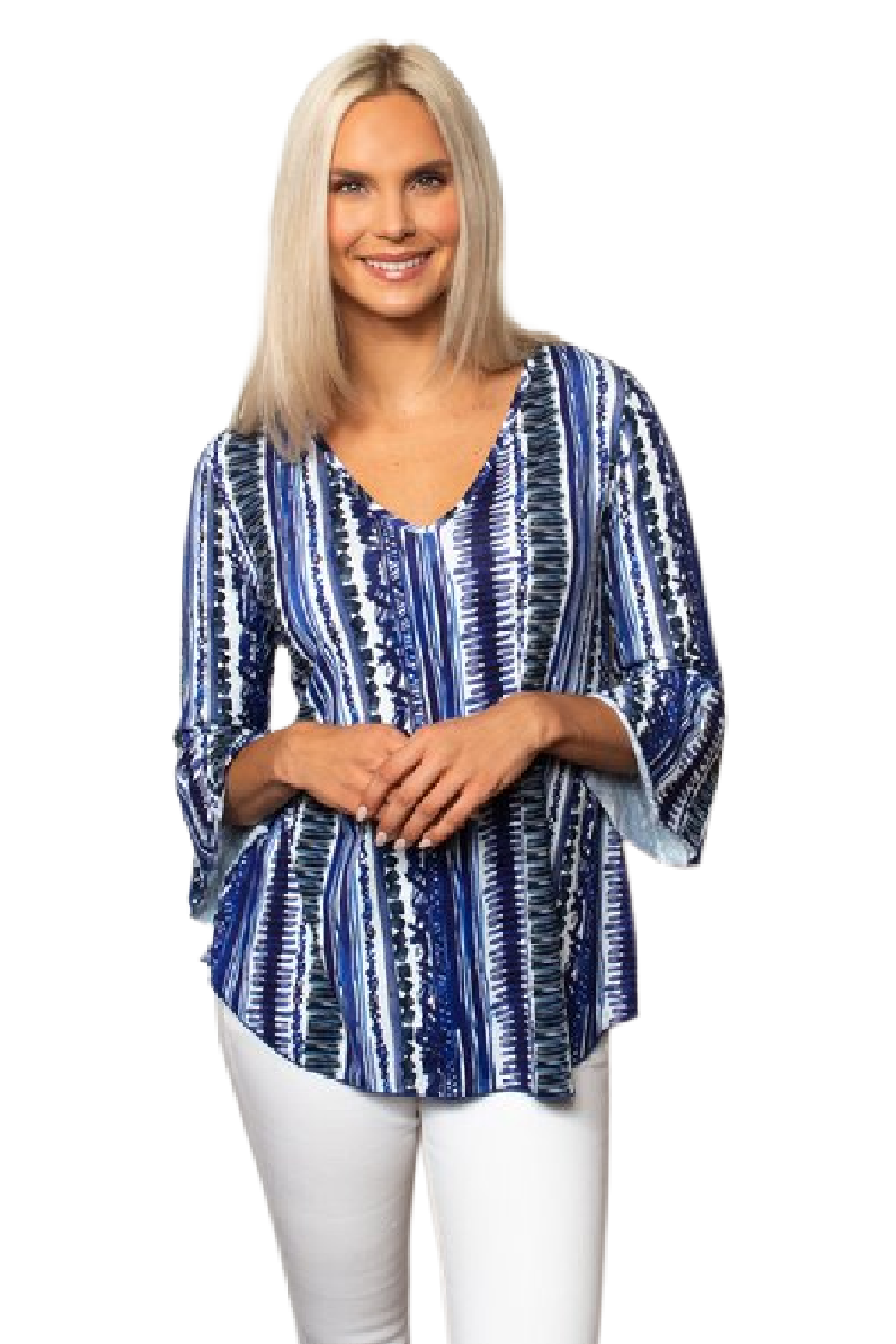 Bali Print Knit V-Neck Top With 3/4 Flounced Sleeves