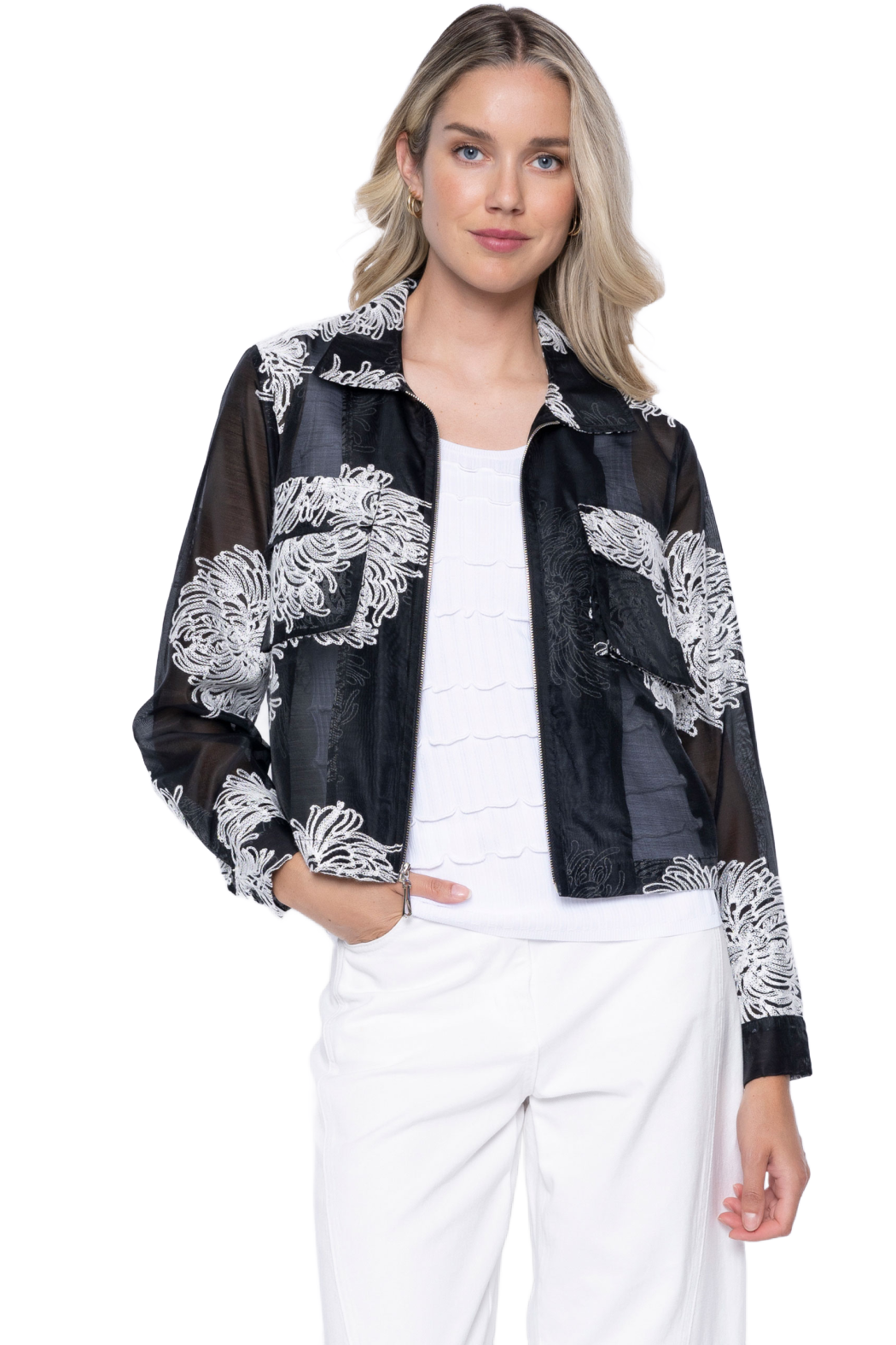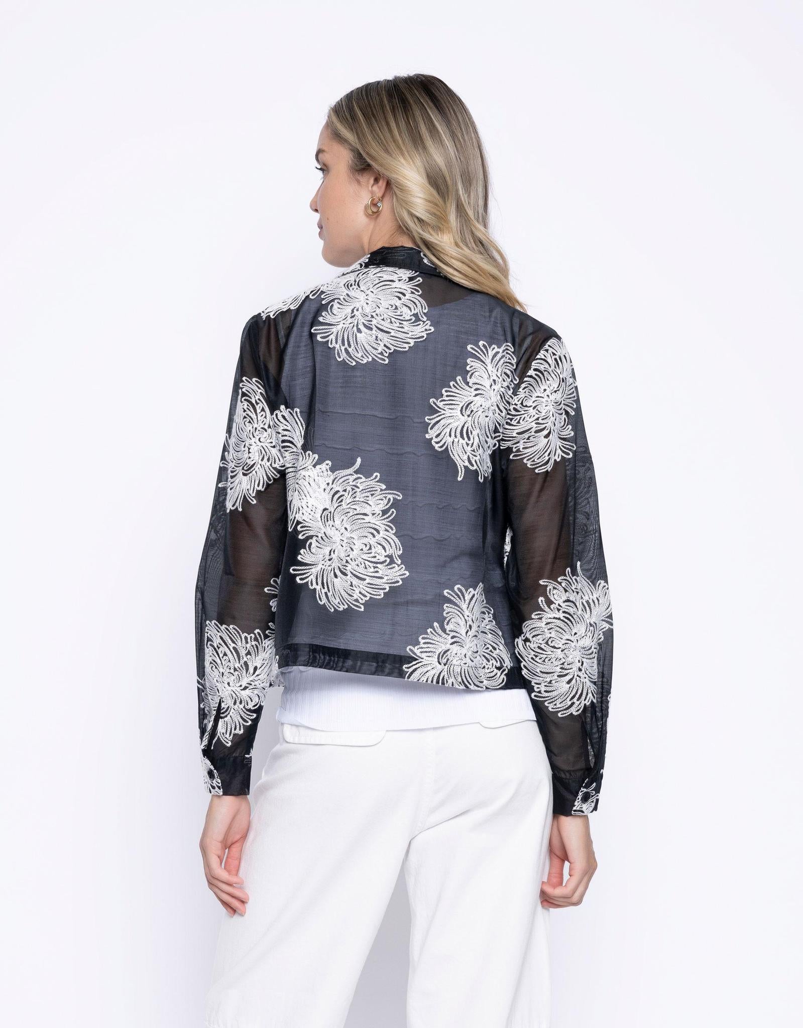 Elevate your wardrobe with this sophisticated sheer black jacket, featuring exquisite white floral embroidery for a striking contrast. Designed with a timeless button-down front and a classic shirt collar, this lightweight jacket effortlessly blends elegance with modern style. The breathable mesh fabric ensures comfort while adding a delicate, ethereal touch to any outfit. Perfect for layering over casual and dressy ensembles, this versatile piece enhances your look with refined texture and detail. Style it with neutral tones or bold colors to create a statement ensemble for any occassion.