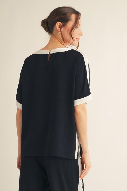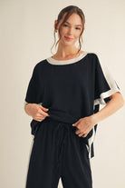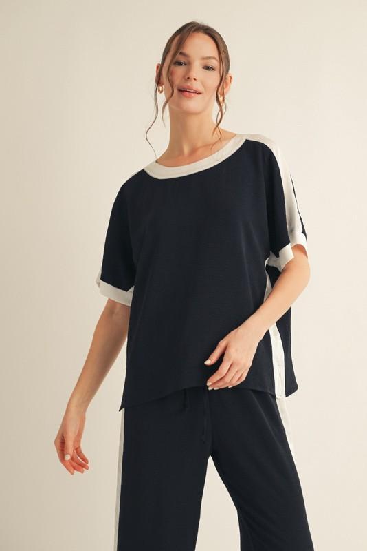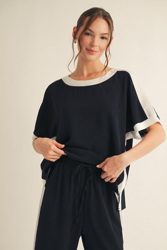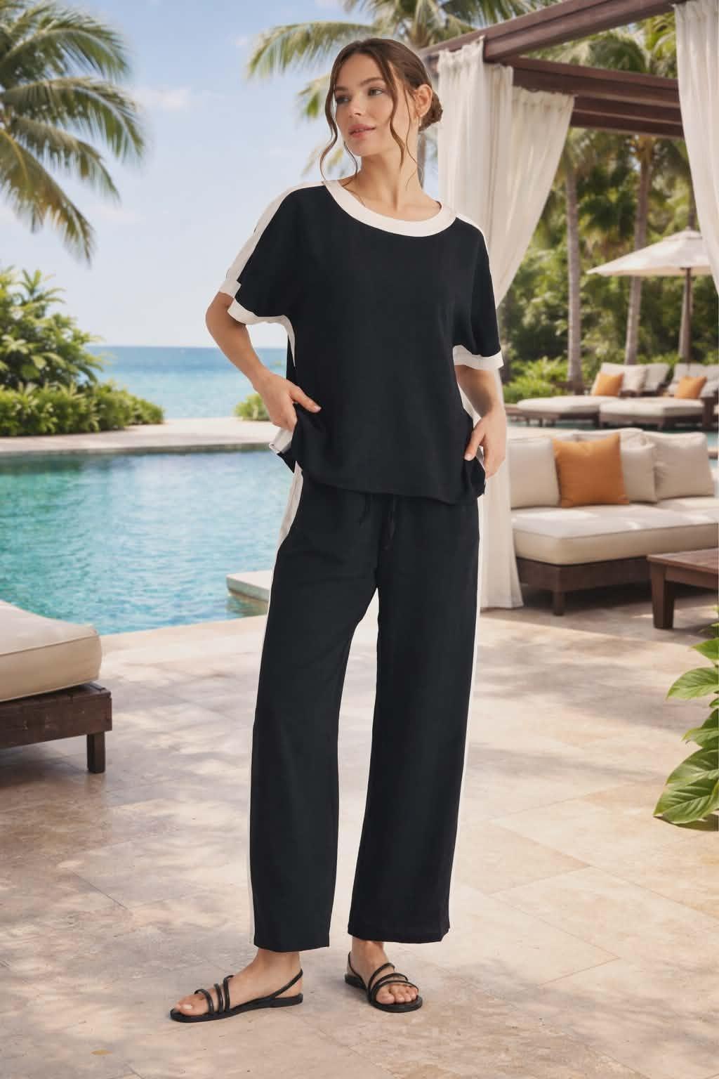 Polished comfort meets effortless style in this silky poly blend two-piece set by Jodifl. Designed with a fluid drape and lightweight feel, this set features a relaxed short-sleeve top with contrast trim at the neckline and sleeves, paired with matching wide-leg pants for an easy, flattering silhouette. The silky texture elevates this casual look, making it perfect for resort wear, travel days, or chic everyday lounging. Wear it together for a streamlined outfit or mix and match with your favorite basics for endless styling options.