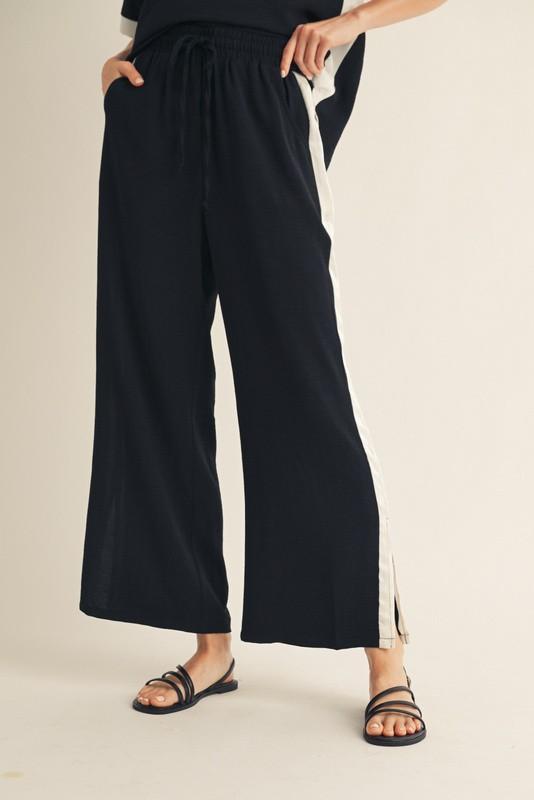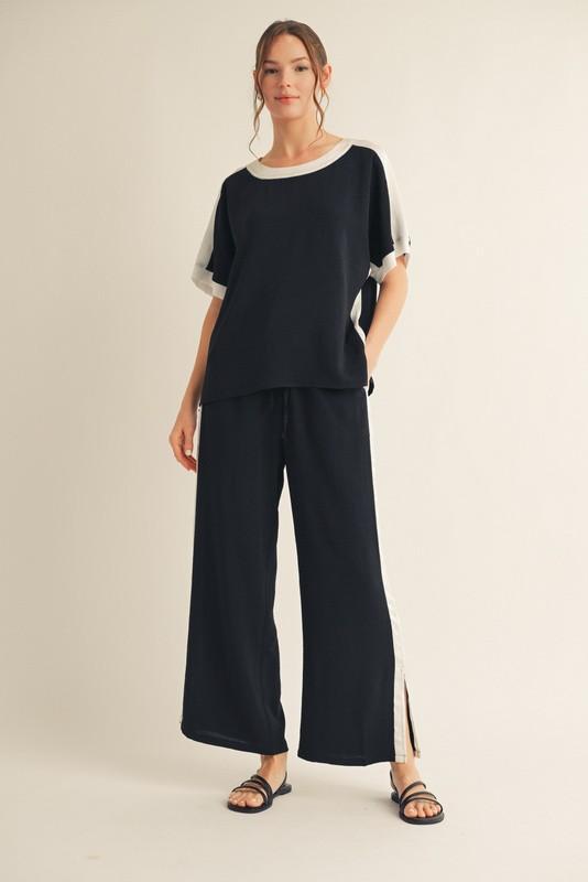 Key Features Two-piece matching set Silky poly blend fabric Short-sleeve relaxed top Contrast trim neckline and sleeves Wide-leg pull-on pants Lightweight with fluid drape Easy, comfortable fit