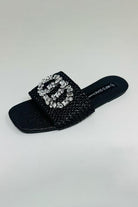 Step into effortless elegance with this Black Raffia Slide Sandal, the perfect blend of natural texture and glamorous detail. Designed for resort-ready days and breezy evenings, this flat sandal features a woven raffia footbed and wide band adorned with a sparkling crystal buckle embellishment. Whether you're strolling along the boardwalk or dressing up a casual outfit, this slide brings instant style with comfort.