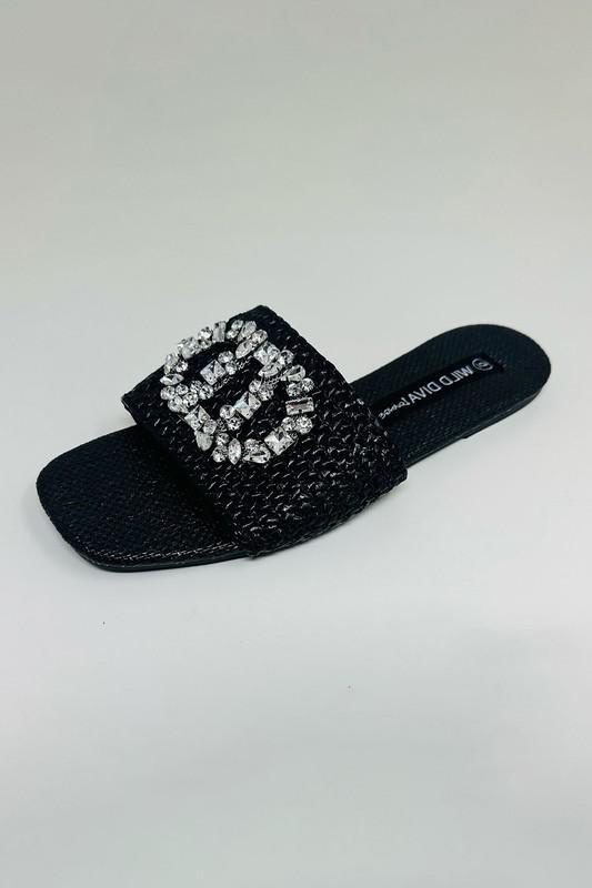 Key Features: Black raffia woven design for a resort-chic look Wide band with dazzling crystal buckle embellishment Easy slip-on style for comfort and convenience Lightly cushioned footbed for all-day wear Flat sole for relaxed, stylish comfort Perfect for vacation, casual outings, or summer events
