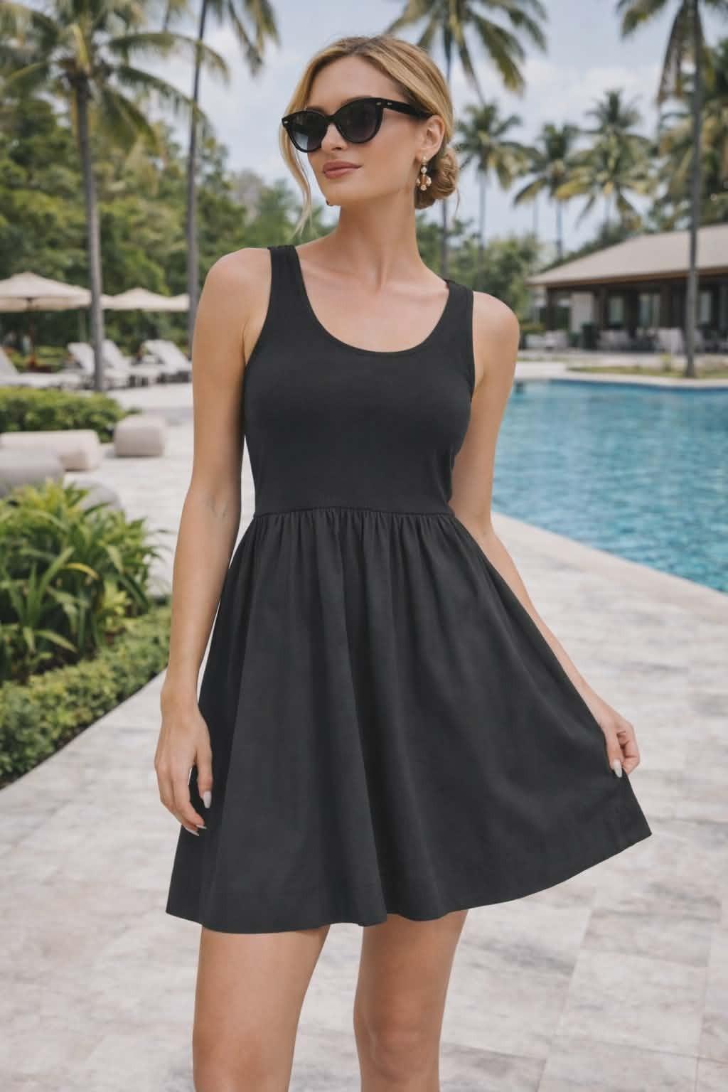 Key Features Flattering fit and flare silhouette Sleeveless design for warm-weather comfort Classic scoop neckline Feminine, softly flared skirt Lightweight, breathable fabric Timeless black color for versatile styling Perfect for resort wear, travel, and day-to-night looks