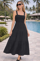 Key Features Flattering smocked bodice for comfortable stretch fit Elegant tiered maxi silhouette Classic black color for versatile styling Wide straps for comfort and support Lightweight, breathable, flowy fabric Feminine and timeless design Ideal for resort wear, travel, cruises, and special occasions