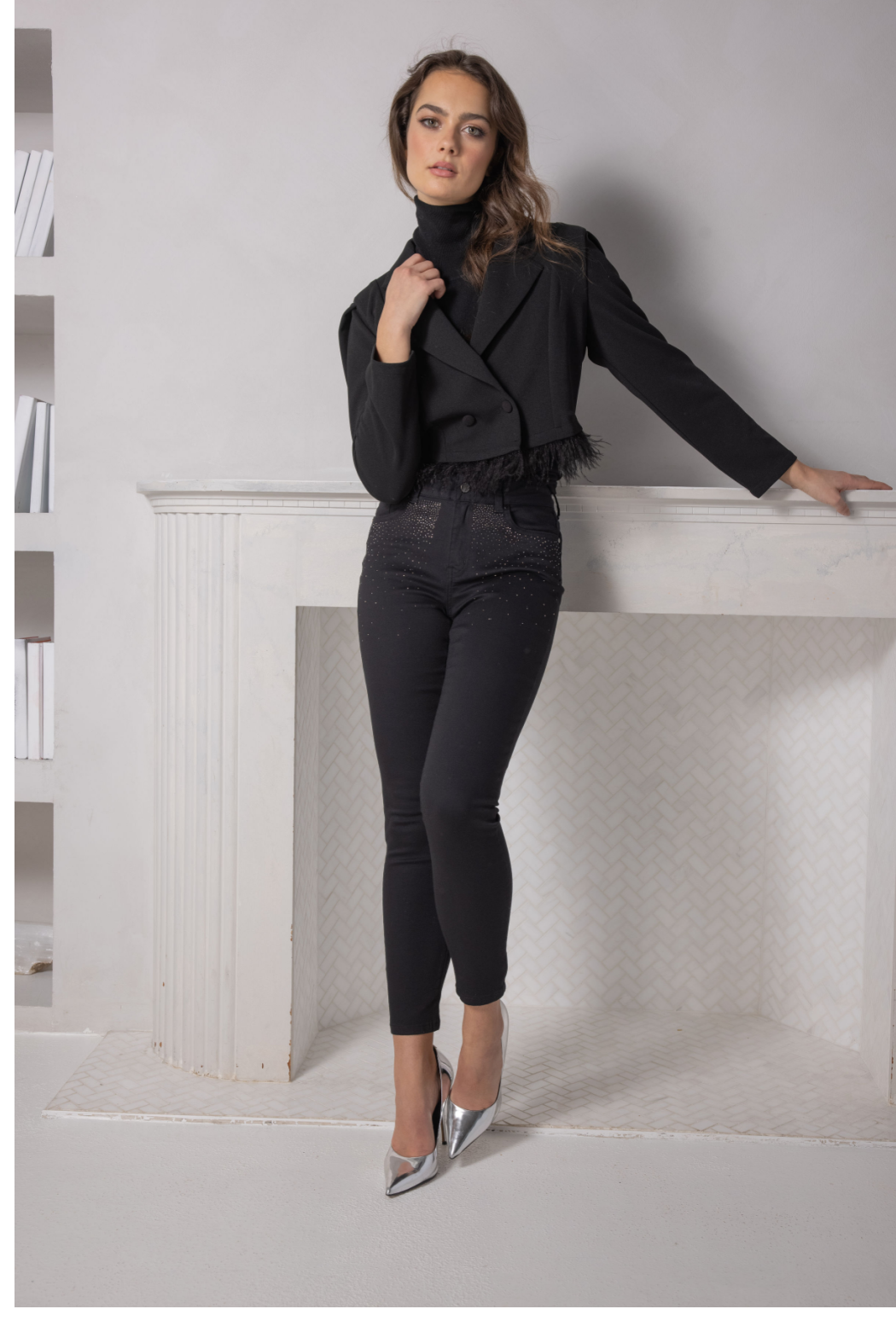 Introducing Our Stunning Black Jeans with Crystal Embellishments with 2 Rear Pockets. They are the Perfect Blend of Style and Sophistication. Crafted with Meticulous Attention to Detail , These Jeans Exude an Air of Elegance and Glamour. Our Black Jeans are Designed to Flatter Your Figure, Providing a Sleek and Slimming Silhouette. The Rhinestone Embellishments add a Touch of Glam, Effortlessly Elevating Your Look. Whether its a Casual Outing or a night Out on the Town, these Jeans are Sure to Turn heads. The Pockets are Strategically Placed to Enhance Your Figure. When You Wear Our Jeans You Will Feel Stylishand Confident Knowing They are Designed to Impress!