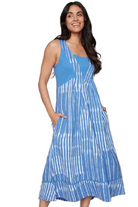 This stylish sleeveless maxi dress combines comfort and elegance with its breezy design. Featuring a flattering square neckline and a flowing A-line silhouette, it drapes beautifully for a relaxed, effortless look. The dress showcases a vibrant blue and white abstract stripe pattern, adding a modern touch to its casual charm. Crafted from lightweight and breathable fabric, it ensures all-day comfort, making it perfect for warm-weather outings, vacations, or casual gatherings. Side pockets provide added functionality, blending practicality with style. Versatile and easy to accessorize, this dress is a must-have for any wardrobe.
