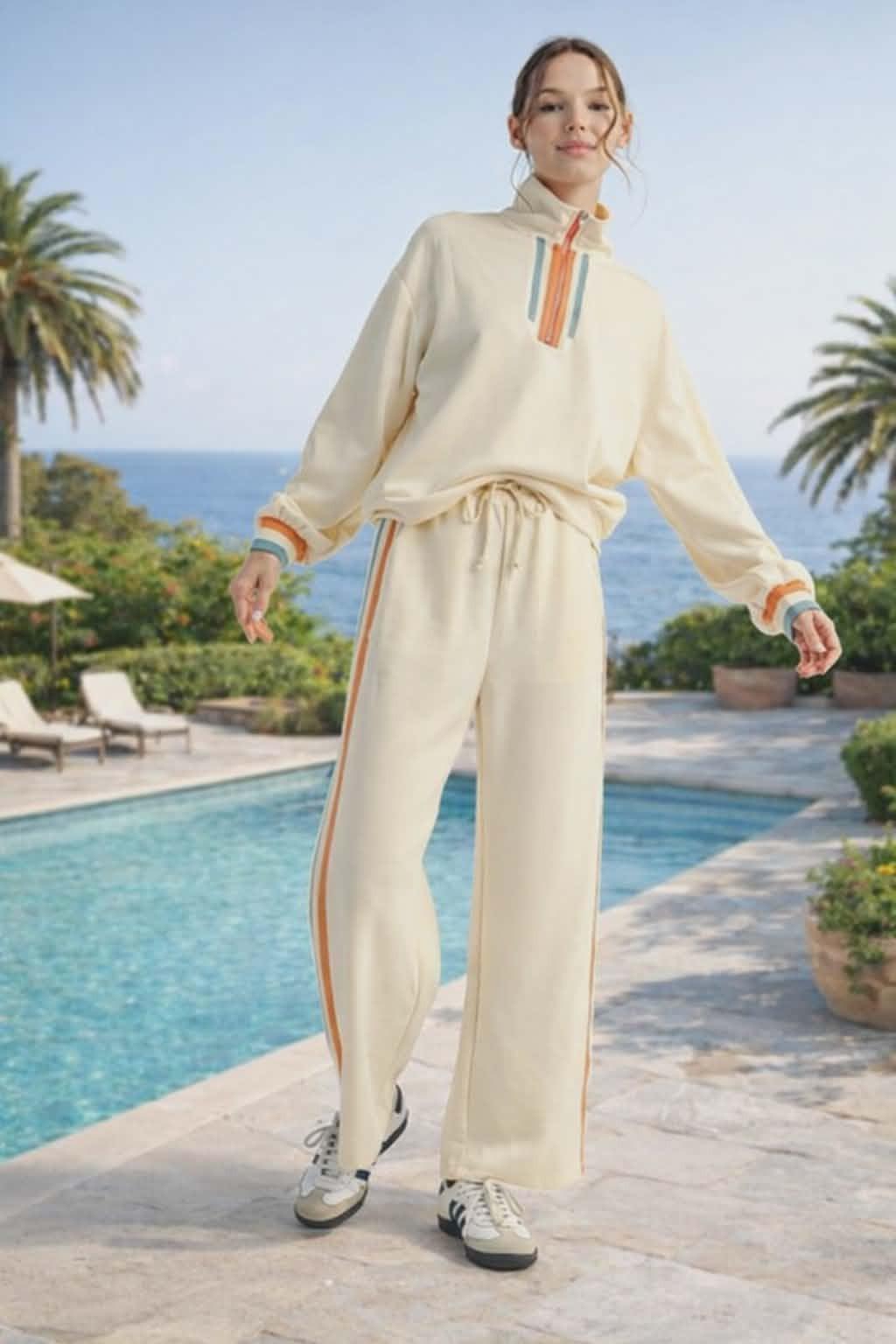 Relaxed yet refined, this Contrast Stripe Knit Lounge Set is the perfect blend of comfort and modern style. Featuring a soft half-zip pullover with subtle contrast trim and matching wide-leg pants, this two-piece set delivers an effortlessly polished look you’ll reach for again and again. Designed with a comfortable elastic drawstring waist and a flattering, easy silhouette, the pants offer all-day wearability while maintaining a chic, elevated feel. The contrast stripe detailing adds a sporty-modern touch, making this set ideal for travel days, casual outings, or elevated lounging. Wear the pieces together for a cohesive statement look or mix and match with your favorite wardrobe staples for endless styling options.