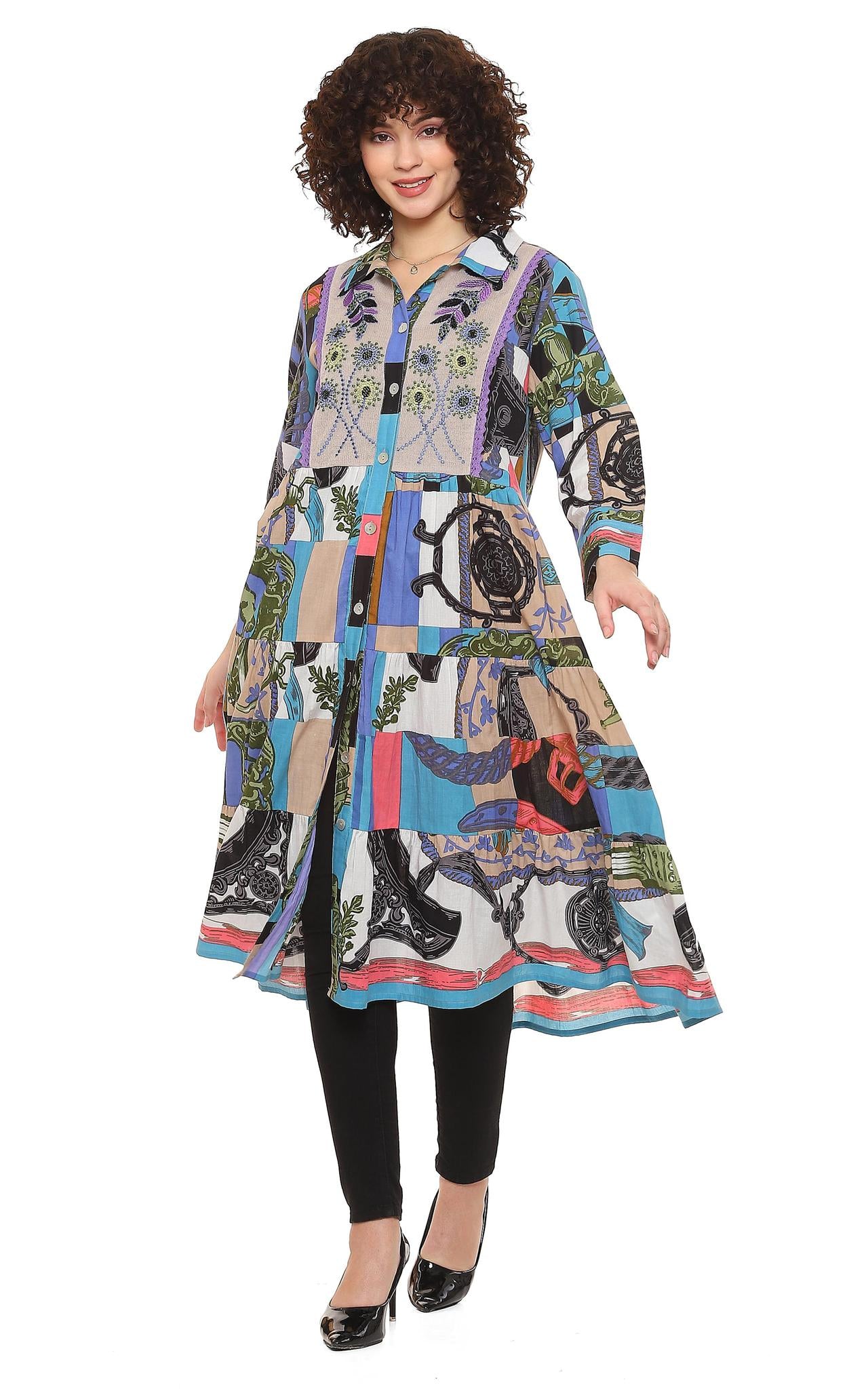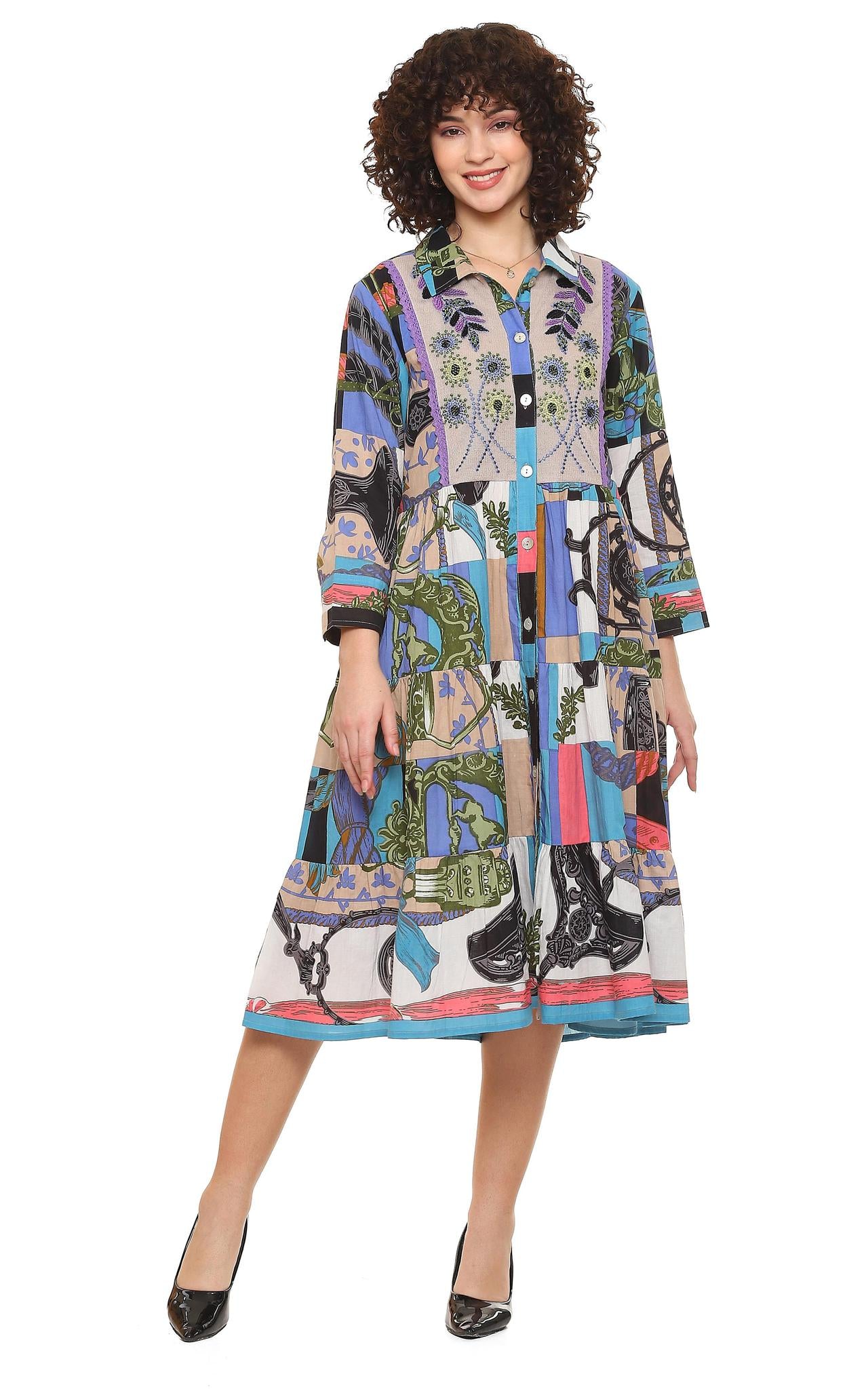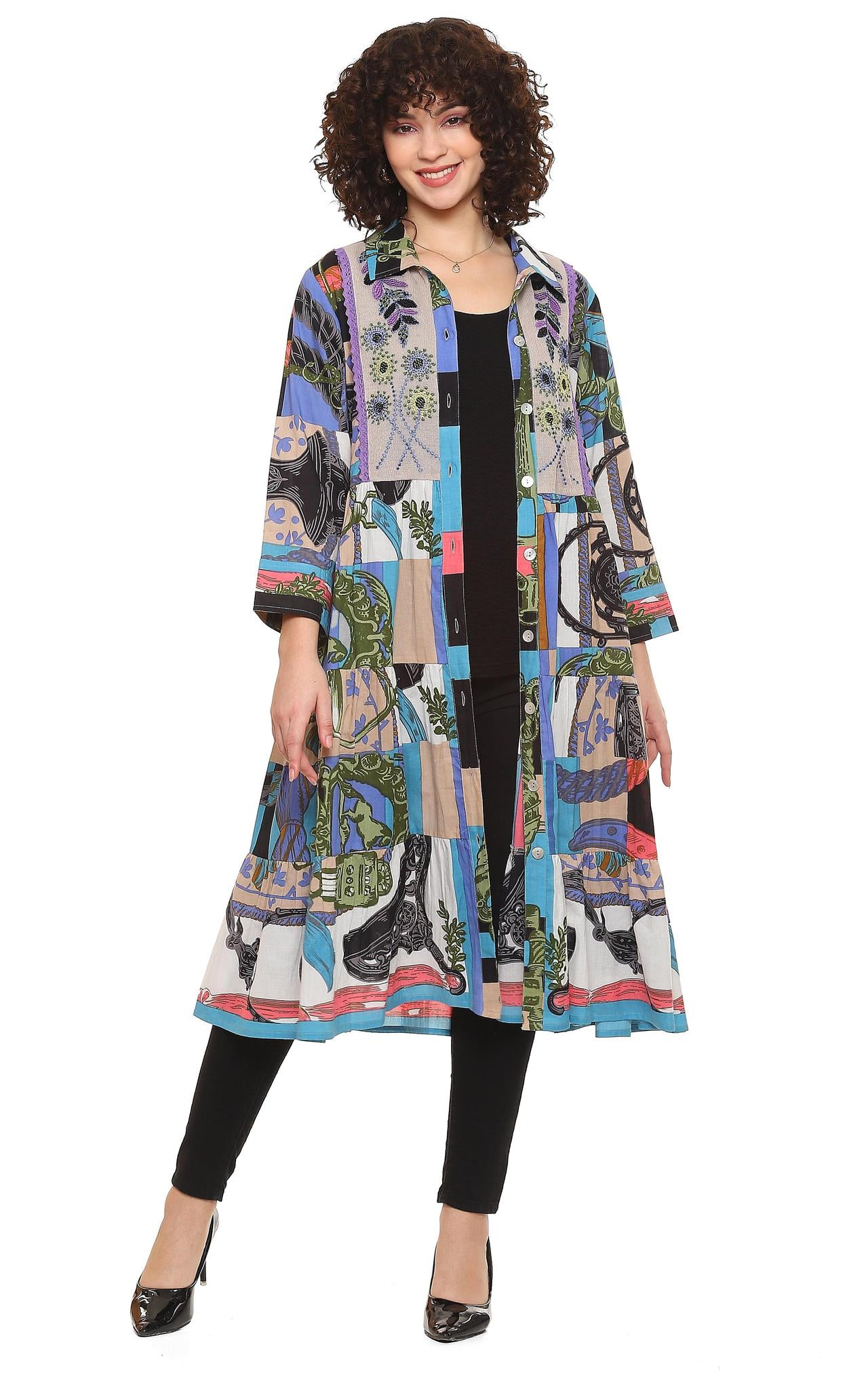 This vibrant and stylish button-down tunic dress features an eclectic patchwork print that combines a variety of colors, patterns, and motifs, making it a standout piece for your wardrobe. Designed with a flared silhouette and a tiered hem, it offers a flattering, comfortable fit that effortlessly blends elegance with casual ease. *Key Features: * - *Material: * Crafted from lightweight, breathable fabric for all-day comfort. - *Design: * multi-color patchwork print with intricate patterns for a bold, artistic look. - *Fit: * Flared silhouette with a tiered hem that provides a flowy, relaxed feel. - *Closure: * Full button-down front for versatile styling as a dress or an open jacket. - *Sleeves: * Long sleeves with adjustable cuff details for added adaptability. - *Collar: * Classic shirt collar adds structure and sophistication. - *Versatility: * Ideal for pairing with slim-fit pants, leggings, or as a standalone tunic dress. With its unique design and blend of colors, this tunic dress is perfect for making a statement at casual outings, creative events, or travel adventures. Add a touch of artful charm to your wardrobe with this versatile and eye-catching piece