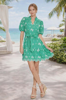 green embroidered dress, bow print dress, resort wear dress, emerald green dress, puff sleeve dress, summer resort dress, vacation dress women, boutique dresses Naples, chic summer dress, lined mini dress, feminine resort dress, Petunias of Naples dress, Boutique in Naples, Naples Boutique, Boutique Naples Florida, Naples Florida Boutique