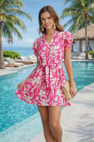 Turn heads in this vibrant hot pink tropical print mini dress, designed for effortless resort-chic style. Featuring a flattering V-neckline, soft flutter sleeves, and a self-tie waist, this lightweight dress creates a feminine silhouette that moves beautifully with you. The bold white botanical print pops against the vivid pink background, making it perfect for vacations, brunch dates, or sunny days in Naples. Easy, breezy, and endlessly stylish—this is your go-to dress for warm-weather elegance.