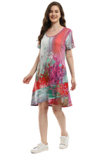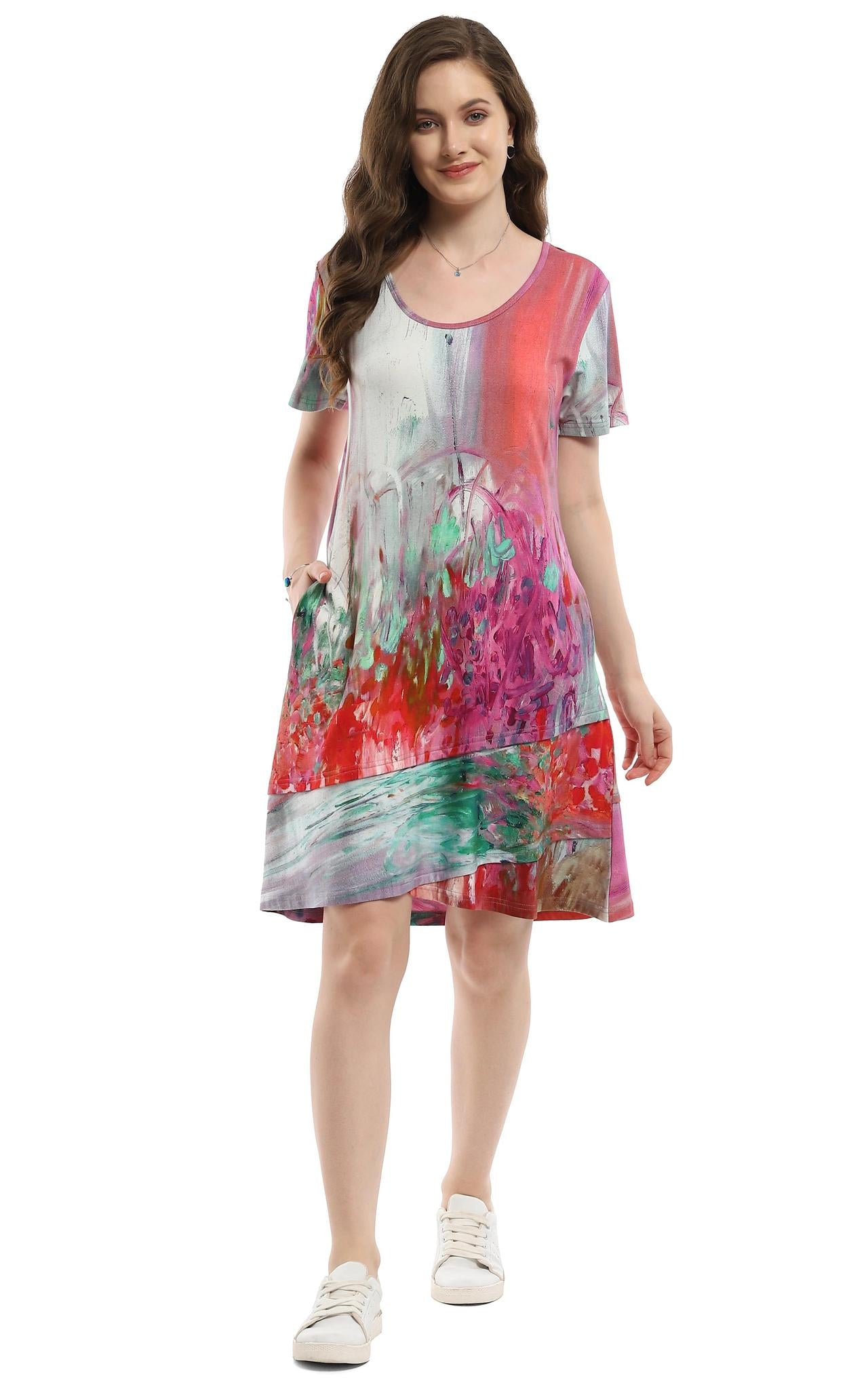 This vibrant short sleeve knit dress features a stunning abstract floral print inspired by brushstroke art, making it a statement piece for casual outings or creative events. Crafted with soft, breathable fabric, this relaxed-fit dress ensures all-day comfort while enhancing movement with its lightweight design. The scoop neckline adds effortless femininity, while the above-knee hemline offers a flattering, versatile style. Perfectly paired with sneakers or sandals, this dress effortlessly combines bold design with practicality, making it a wardrobe essential for art enthusiasts and lovers of unique, colorful fashion.
