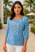 Keywords: Sno Skins crinkle top, lightweight poly blouse, made in USA top, ocean print top, travel-friendly tunic, resort wear, textured blouse, 3/4 sleeve top, Naples Boutique, Boutique in Naples, Boutique Naples Florida, Naples Florida Boutique