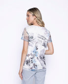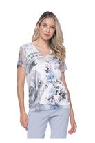 This stylish short-sleeve V-neck top features a unique mixed-media print combining newspaper text, floral elements, and artistic graphics in soft, neutral tones with pops of blue. The lightweight fabric ensures all-day comfort, while the sheer, textured sleeves add an elegant touch. Designed for a relaxed fit, this top drapes beautifully for a flattering silhouette. The asymmetrical hemline mesh accents and touch of sequins enhance the modern, casual-chic aesthetic, making it perfect for pairing with jeans, trousers, or skirts. Ideal for casual outings or dressed-up daywear, this top effortlessly blends artistic design with everyday comfort.