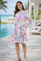 Bright, playful, and effortlessly chic, this Parsley & Sage Abstract Tiered Dress is made for sunny days and resort escapes. Featuring a vibrant swirl print in pink, turquoise, orange, and soft neutrals, this dress delivers bold color with an easy, flattering silhouette. Designed with a split V-neckline, relaxed fit, and tiered skirt, it offers comfortable movement while maintaining a polished look. The lightweight fabric and three-quarter sleeves make it perfect for warm weather, whether you’re heading to brunch, vacation dinners, or a casual coastal event. Style it with wedges or sandals for a carefree resort look that transitions beautifully from day to night.